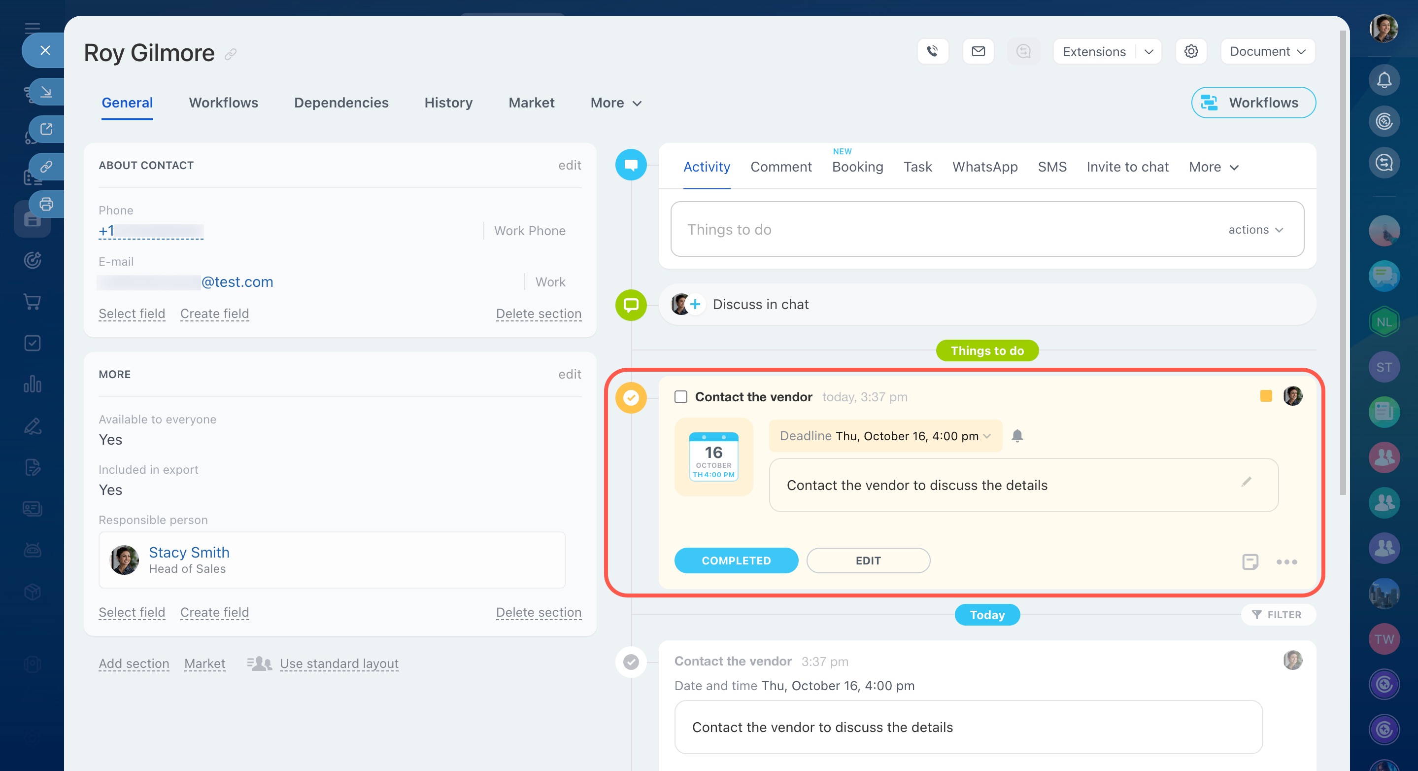 - Plan activities in the vendor form: If you need to create a new supply contract or prepare documents, set a task for your employees from the form. This helps you track the entire history of your work with the vendor and stay on top of progress.