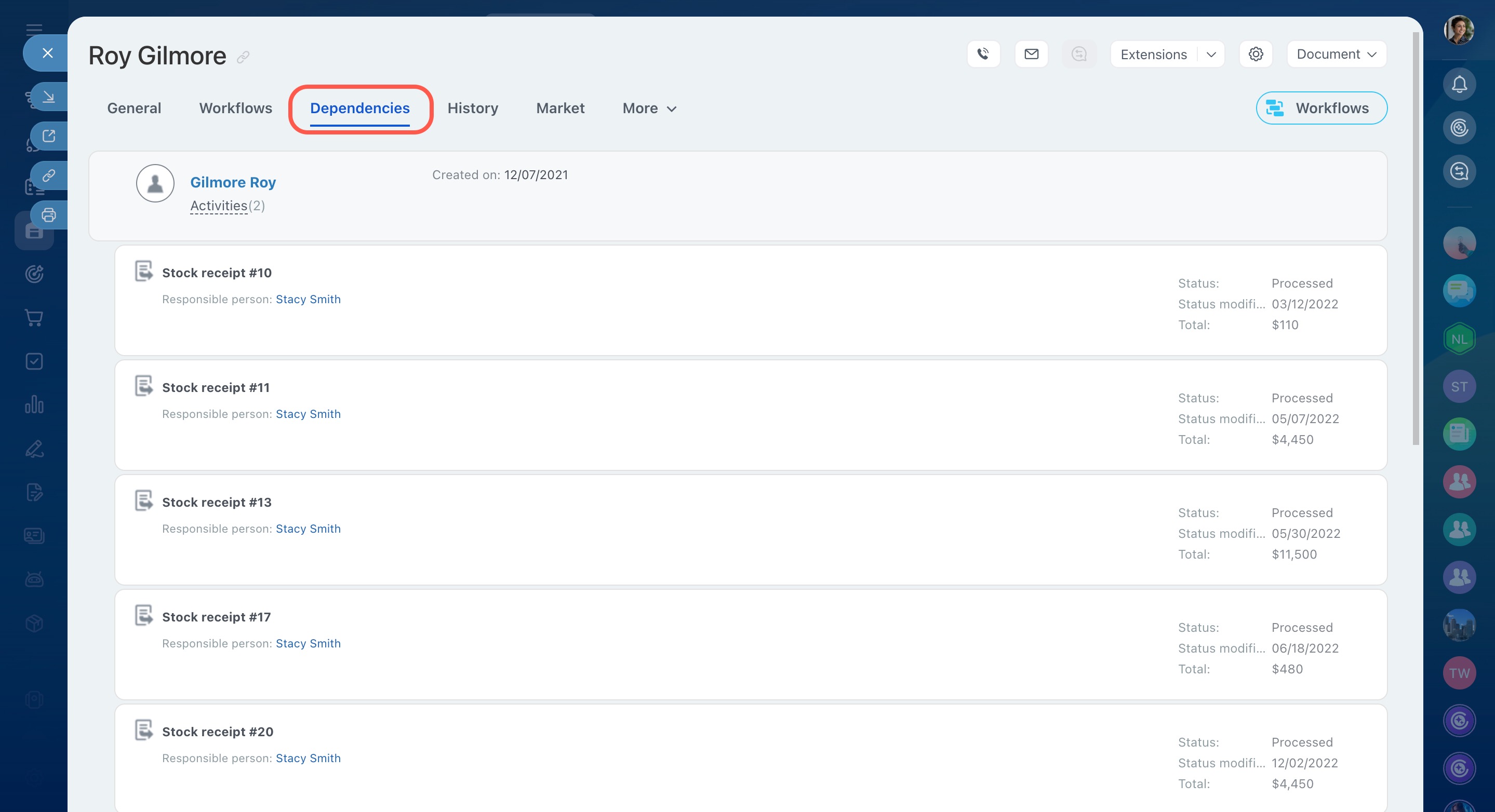 You can also view a list of vendor contacts and the document history in the Dependencies tab.