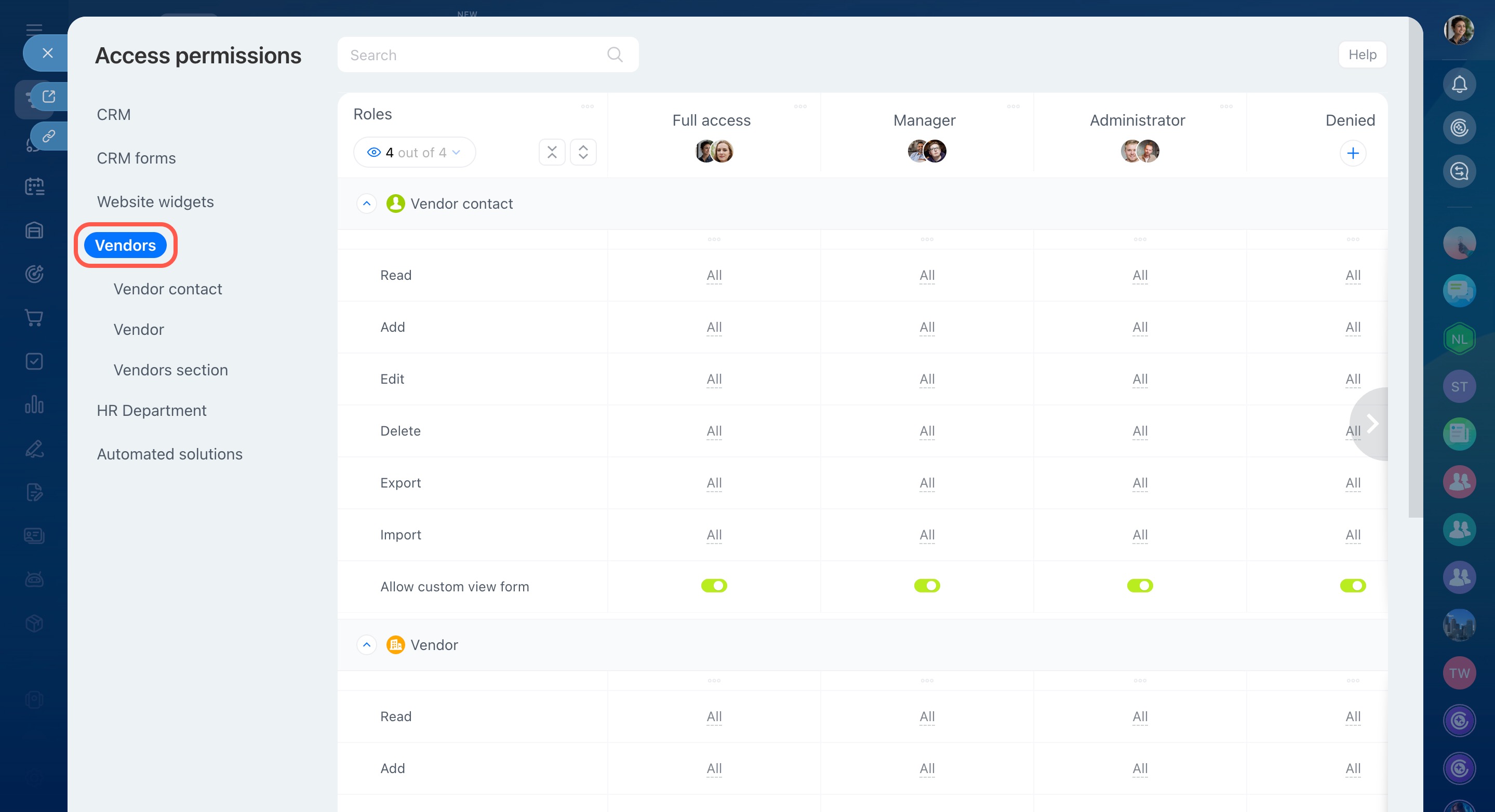- Open the Vendors tab and adjust the permissions as needed.