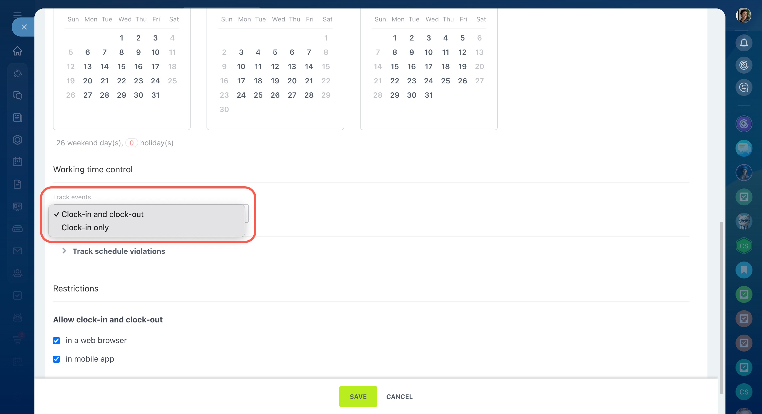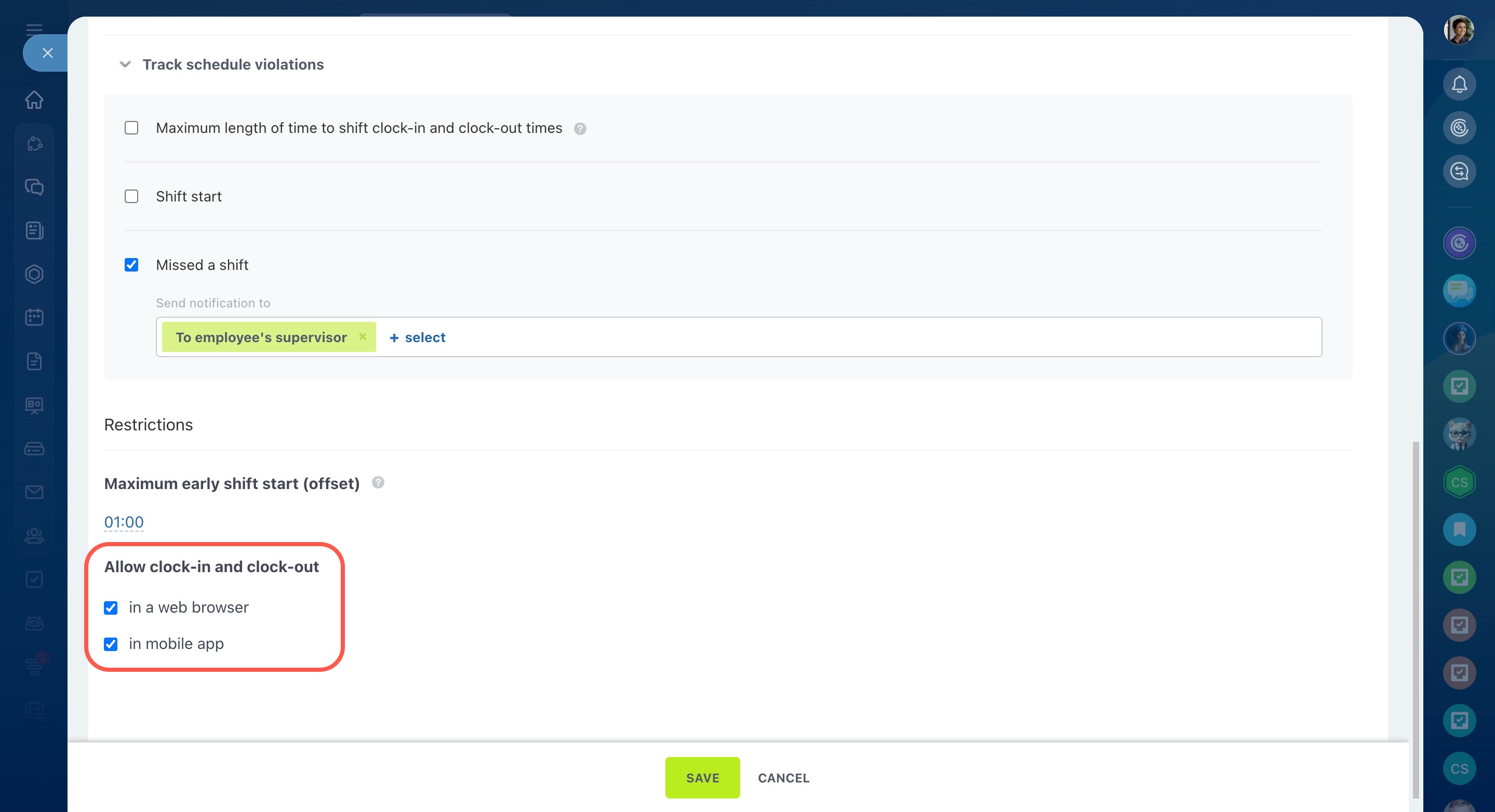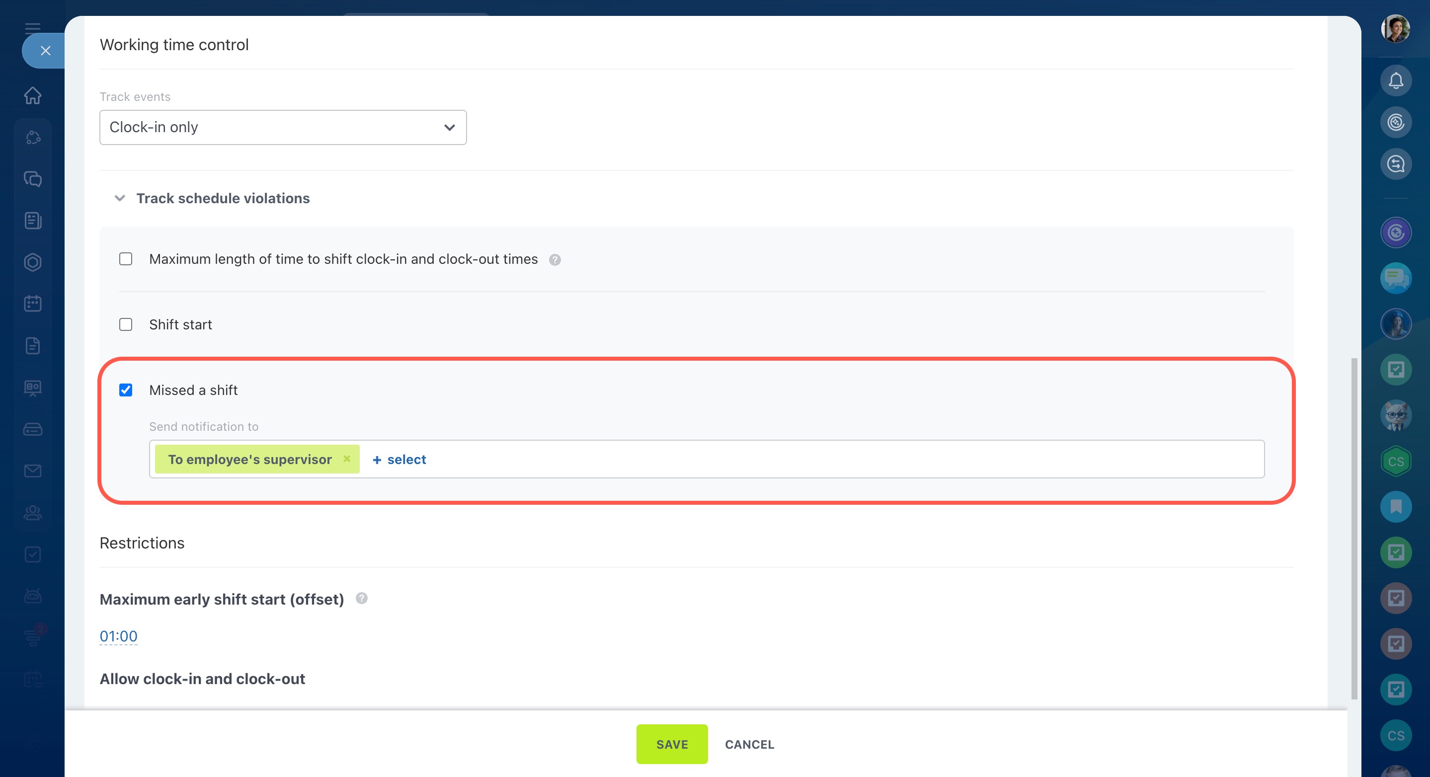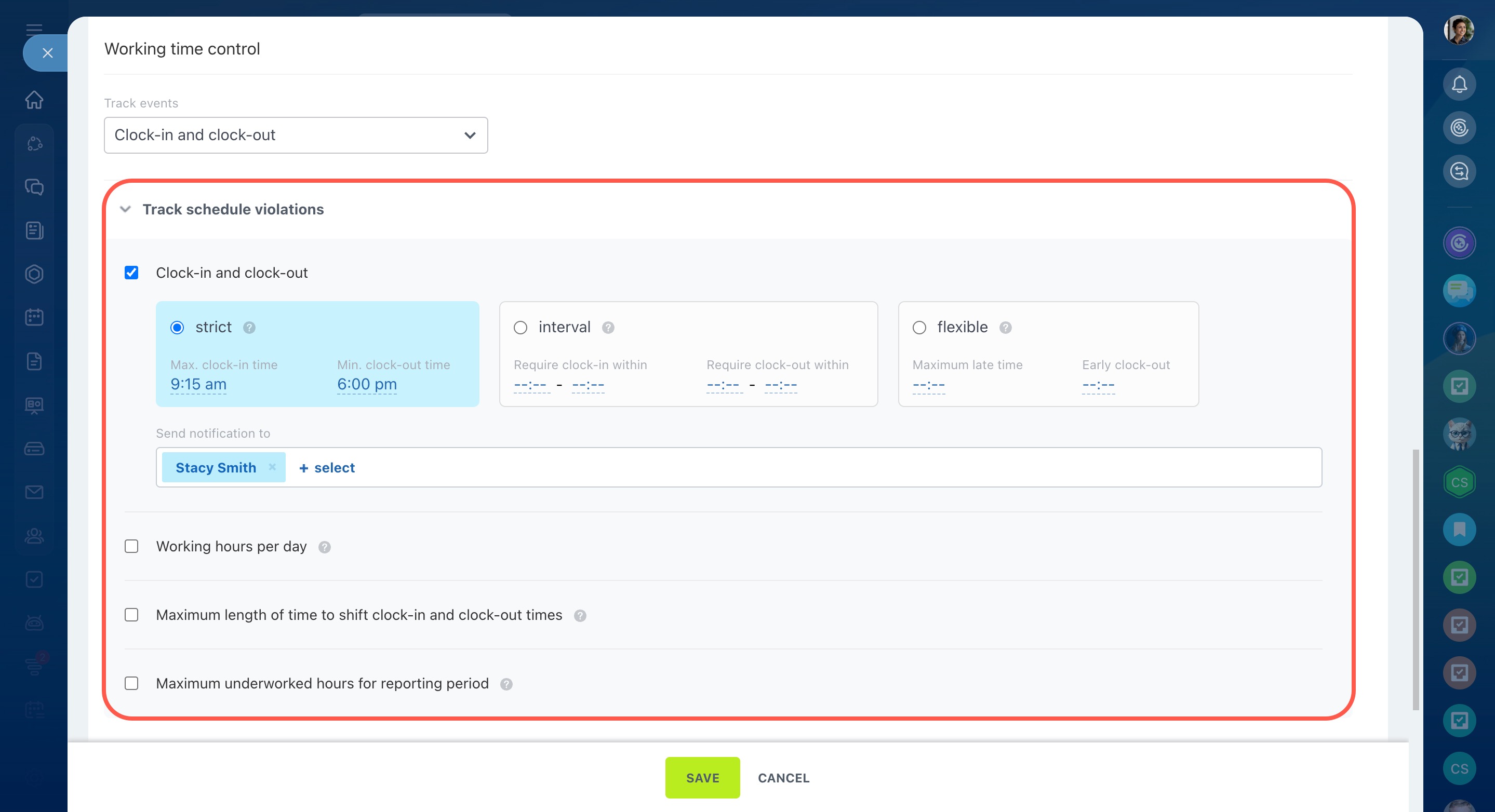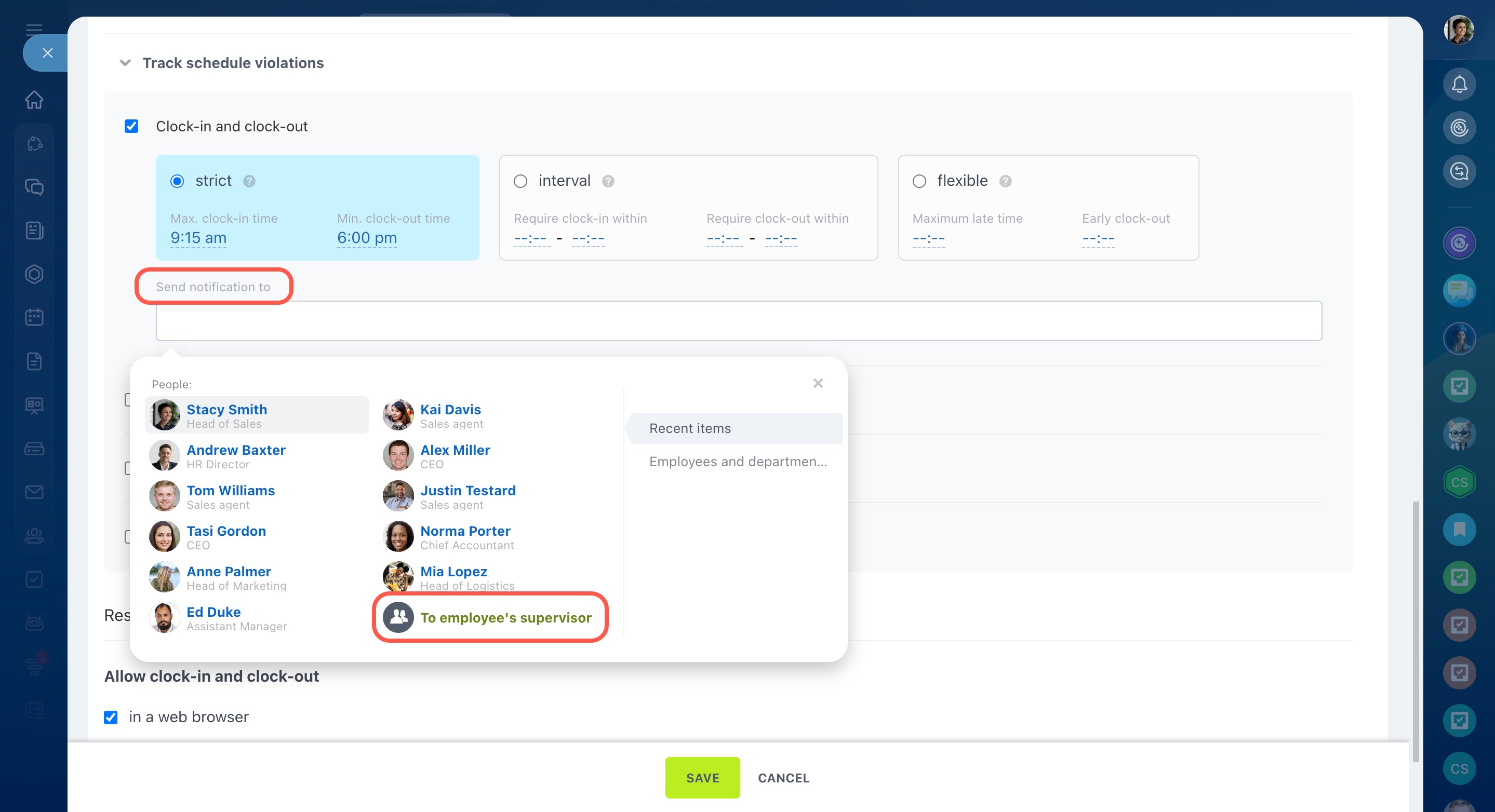 - Clock-in and clock-out: Set required times for clocking in and out. If an employee violates these times, notifications will be sent to the selected recipients.