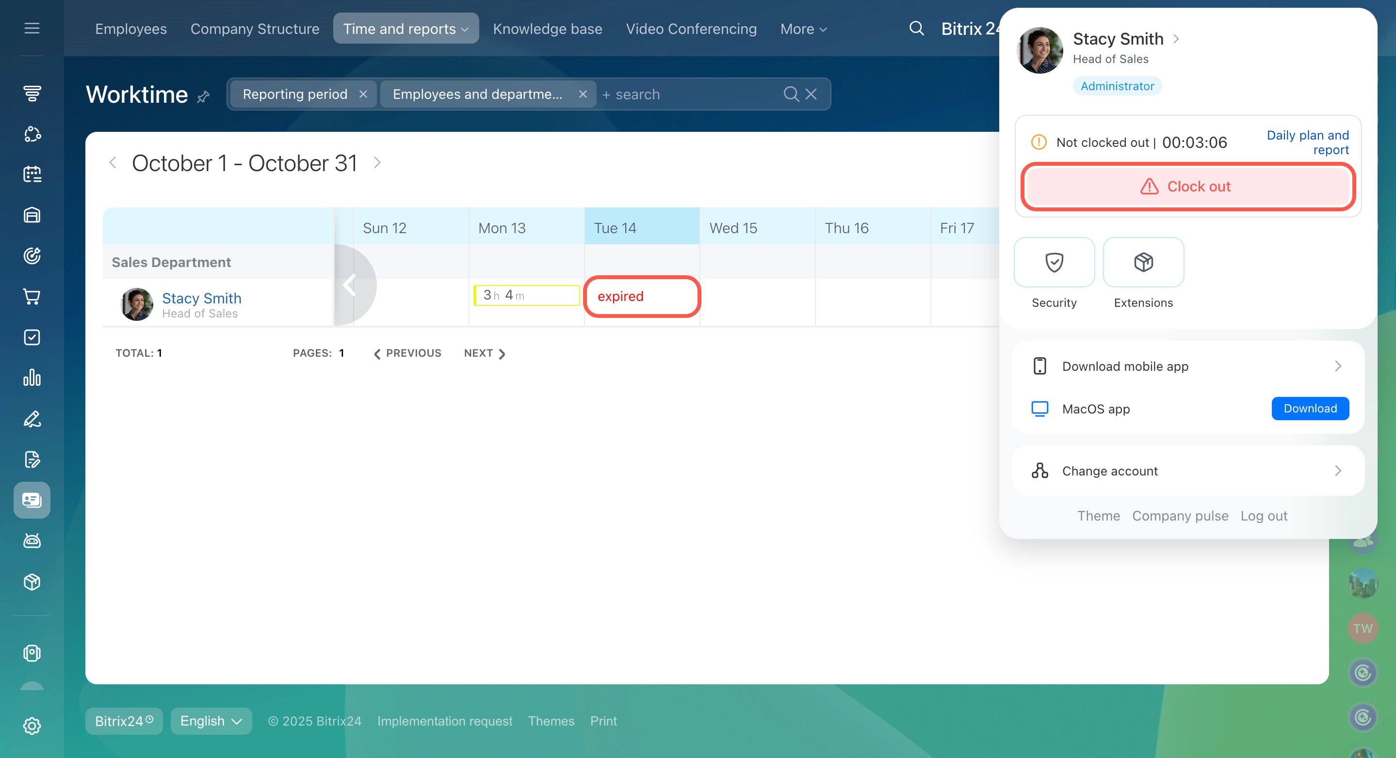 In that case, the employee will need to clock out and provide a reason. If the recorded time is incorrect, the administrator can edit it in the Worktime tab.