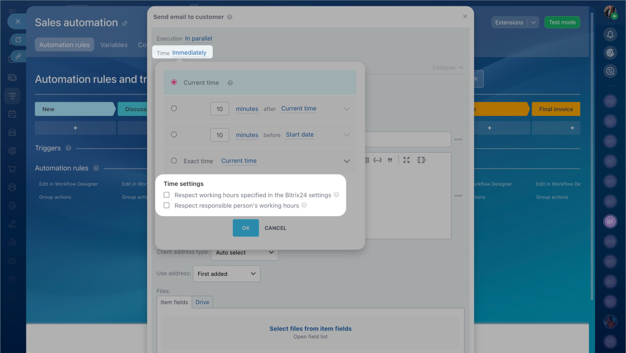- The option takes into account only the working hours of the employee responsible for the CRM item. If the worktime reporting option is also enabled, the automation rule will start if both of these conditions are met.