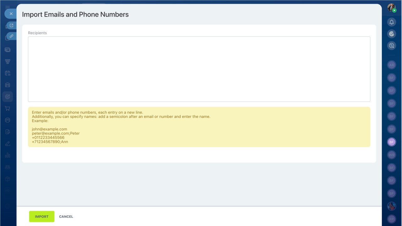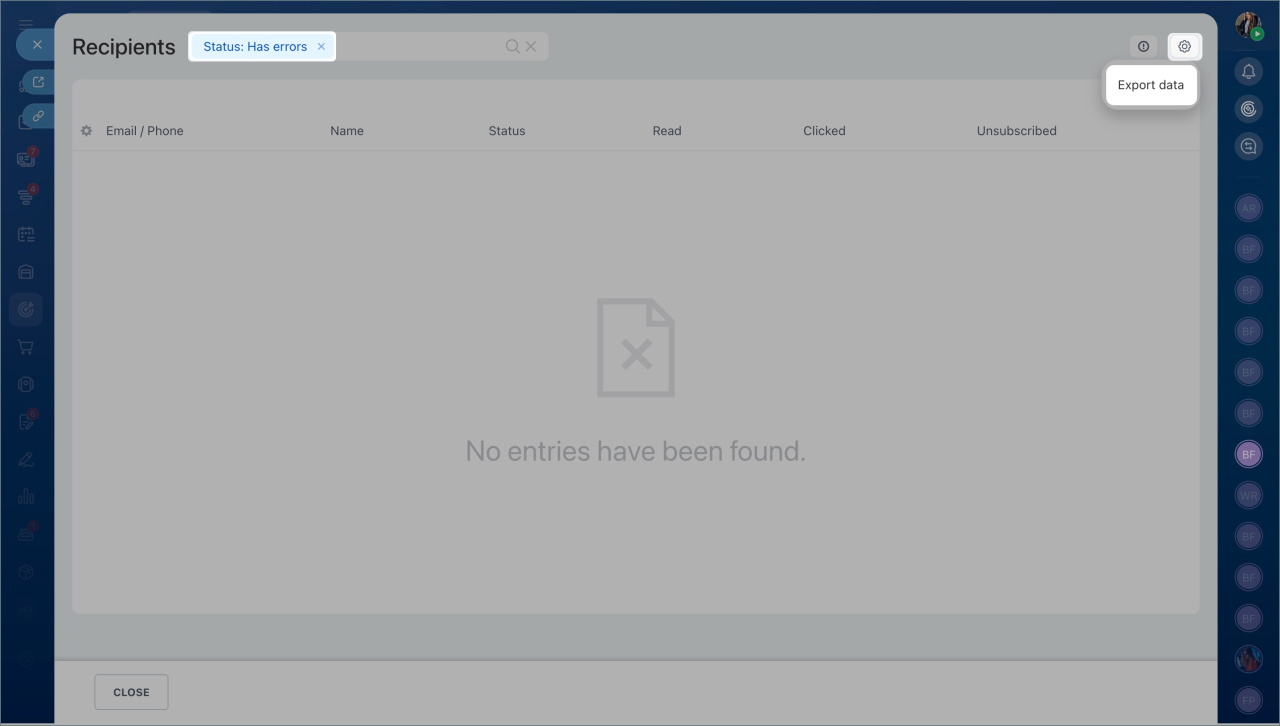 - To export the list of recipients with the Has errors status, click the settings icon in the top right corner and select Export data.