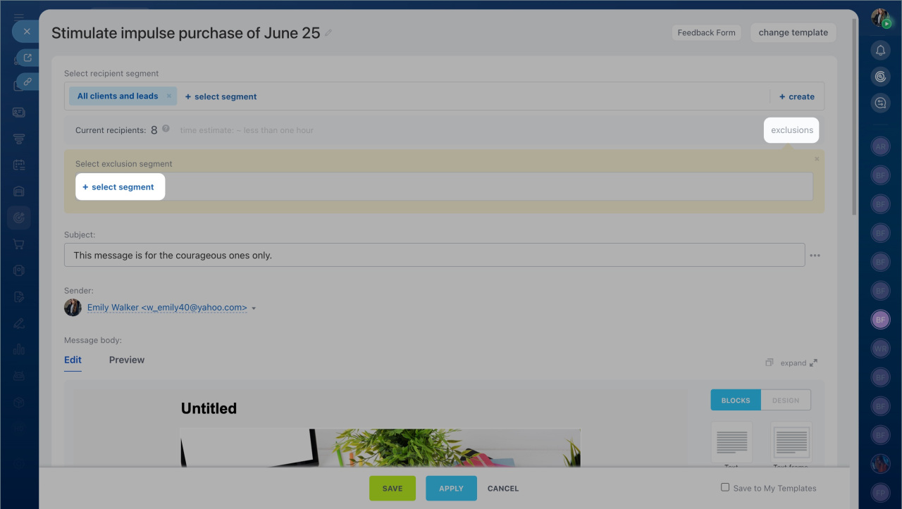 When you are creating a new email campaign, click Exclusions and choose the segment you created. Regardless of the option you choose, messages won't be sent to these wrong addresses again, avoiding more errors.