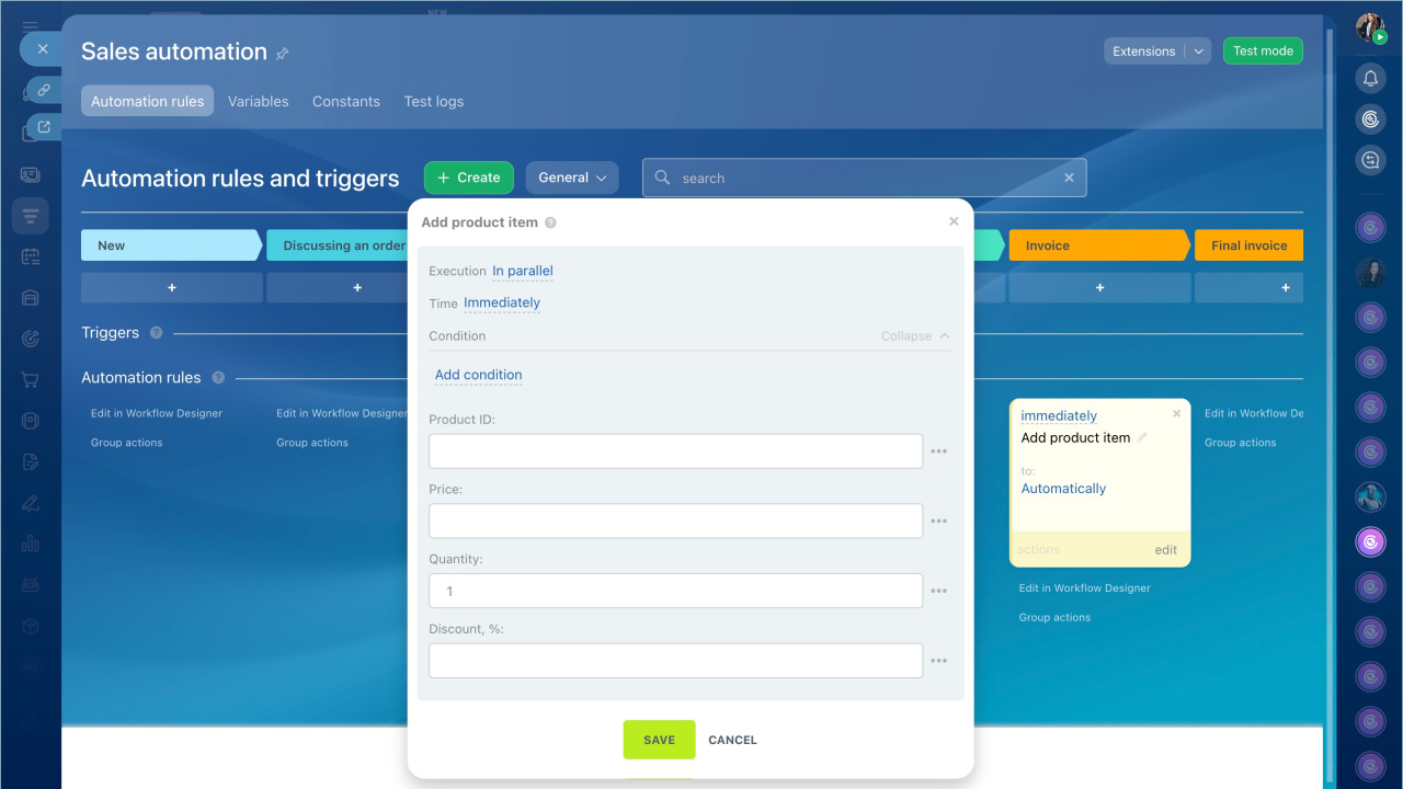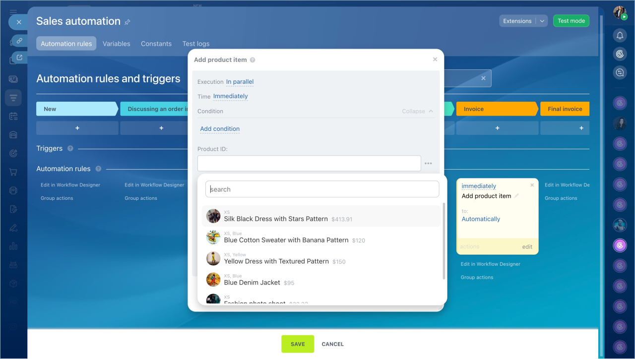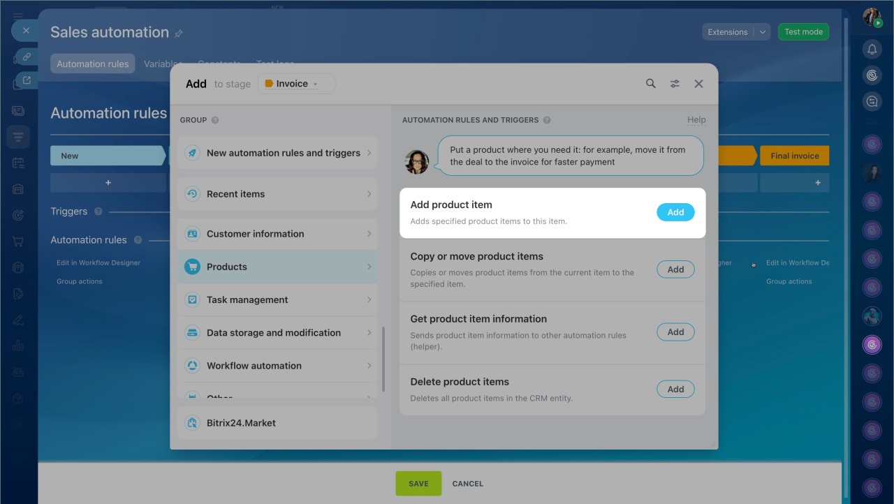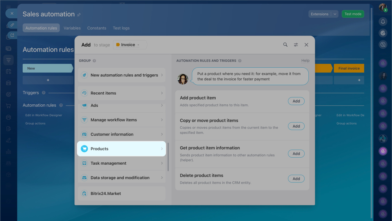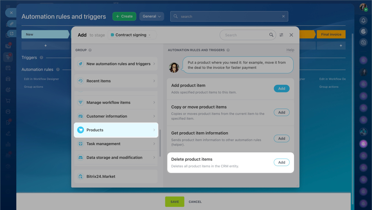 When a CRM item reaches a specific stage, the automation rule adds a selected product to it. For example, when creating a new deal, it adds a basic product or a service.