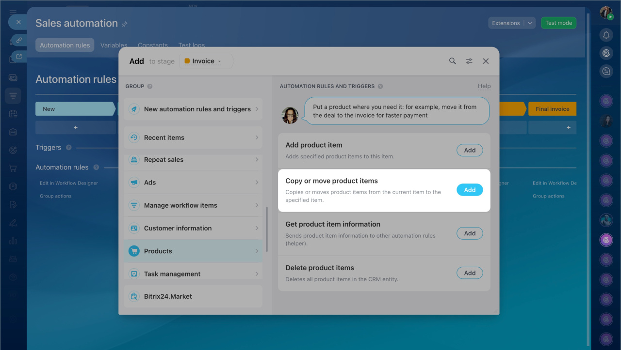 Let's check how the automation rule worked. When the deal reached the certain stage, the automation rule copies the product to the form of the new deal.
