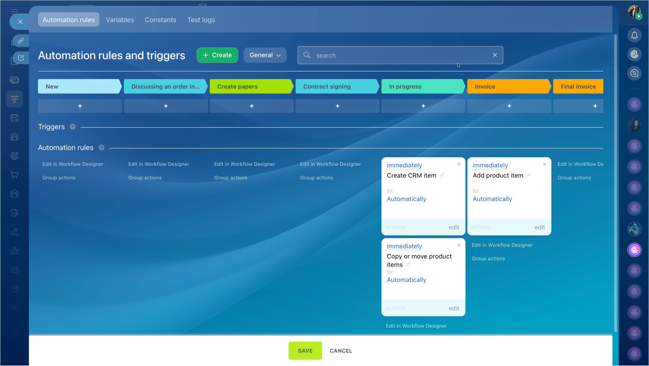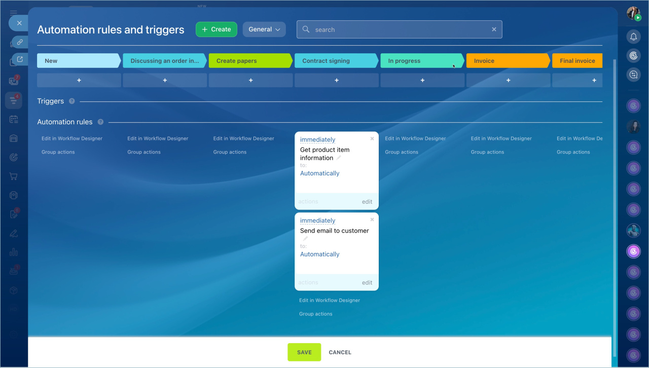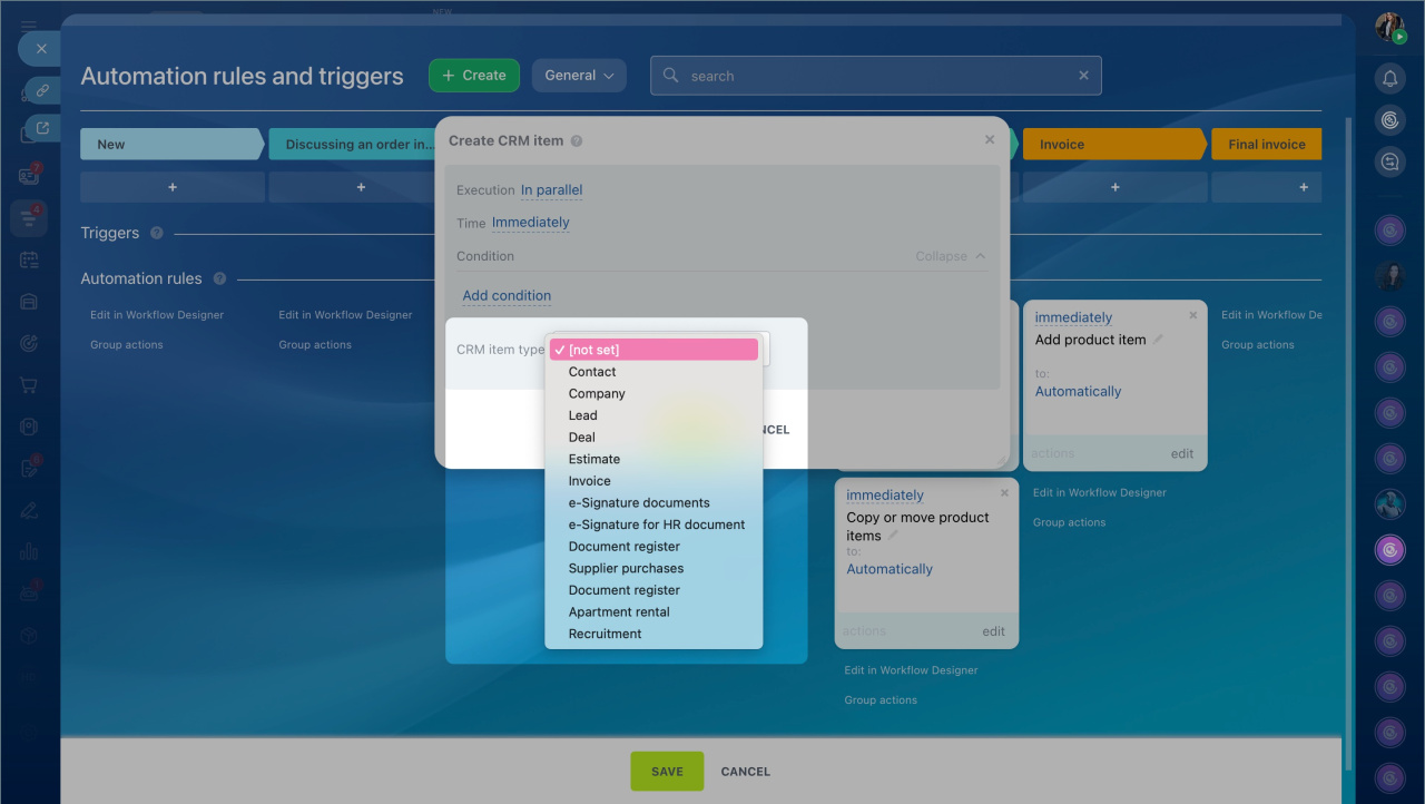 - Go to the CRM section, select an item and click on the Automation rule icon.