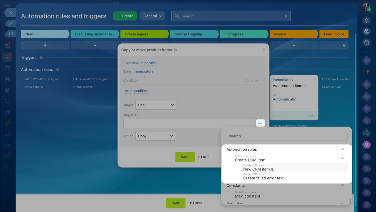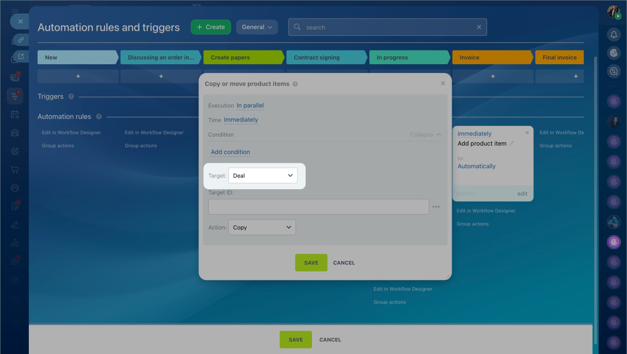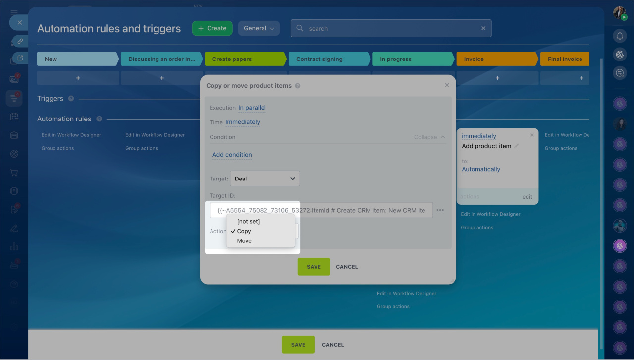 Target ID. Specify the ID of the CRM item to which the automation rule will copy or move the product. To copy products to a deal created by another automation rule, click Three dots (...) > Automation rules > Create CRM item > New CRM item ID.