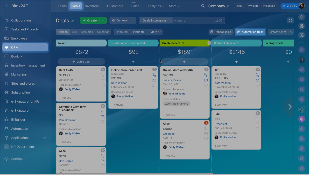 Automation rules can streamline various customer interaction scenarios: create an estimate, send an email, schedule a call or meeting, and more.