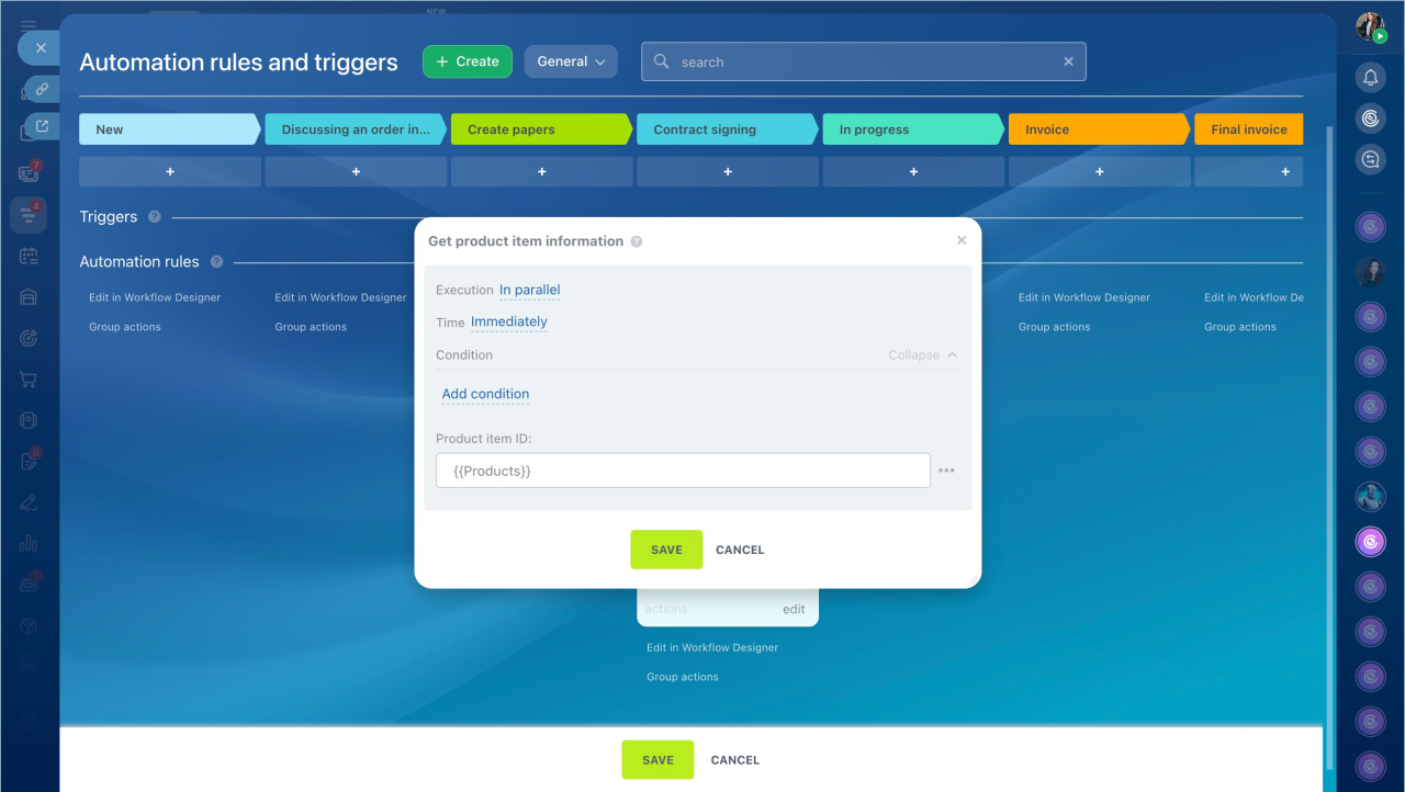 When the deal moved to the certain stage, the first automation rule gets the product information, and the second one sends an email to the client.