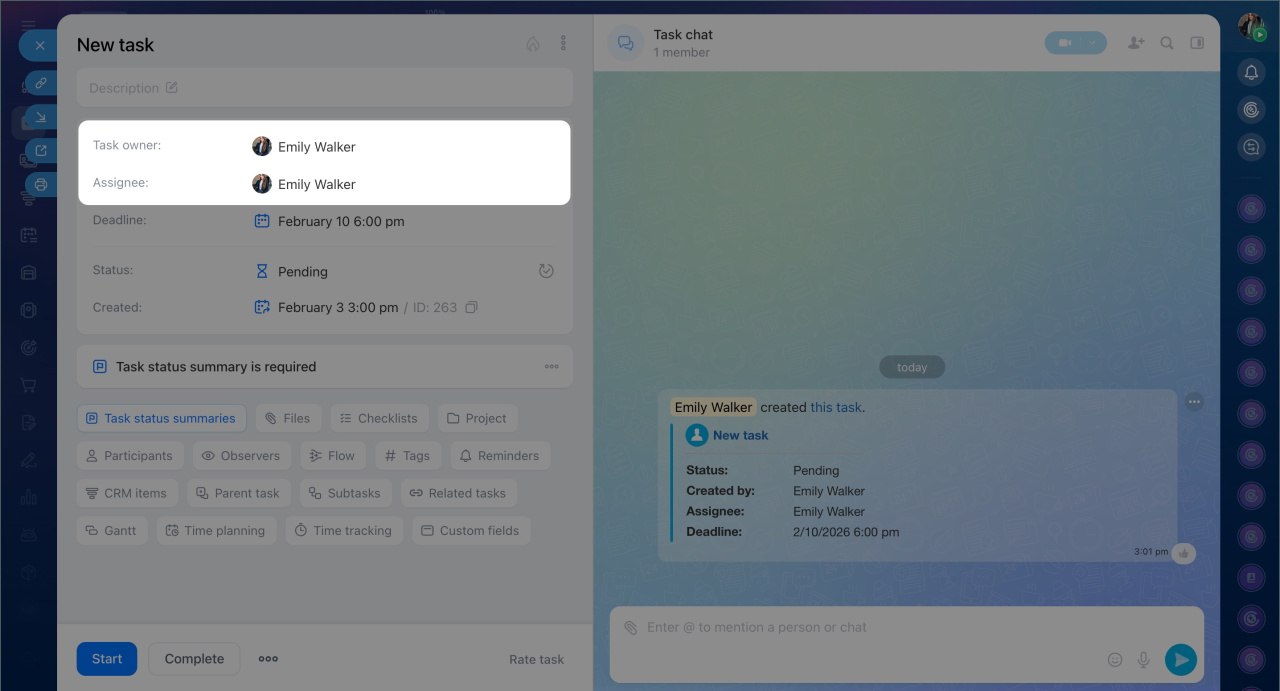 When the email is sent, the task will appear in Bitrix24. By default, the employee from whose profile the link was copied will be a task owner and an assignee in the task. The roles of users can be changed.