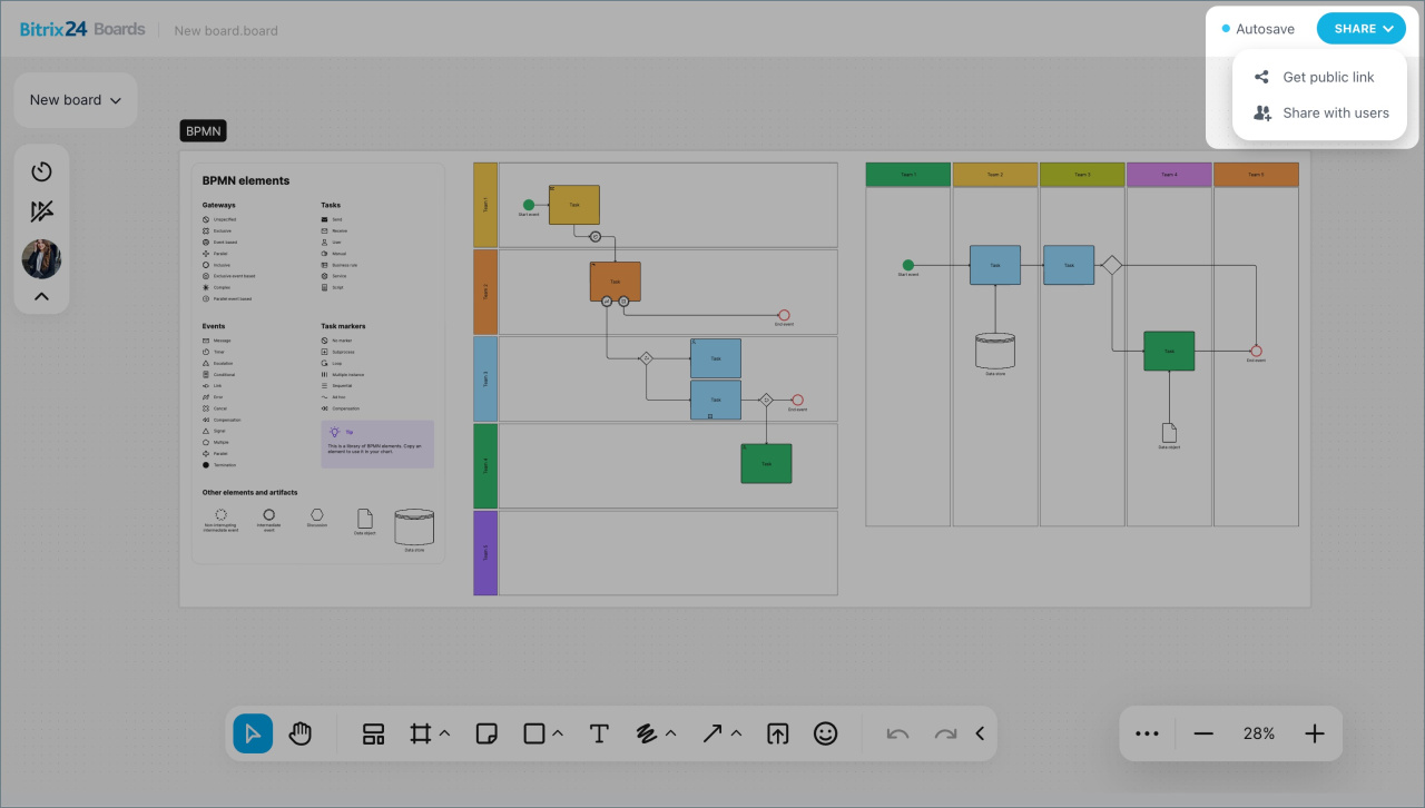 - Bitrix24 Boards are collaborative spaces. A team can use a single board to gather ideas, discuss layouts, plan presentations, and visualize processes without switching to external services.