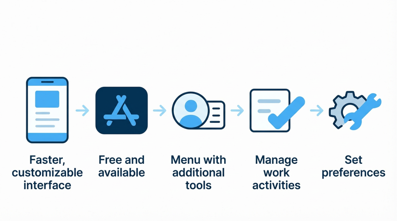 - In the app, you can manage work hours, check-in, access your profile, documents, settings, and quickly switch to another account.