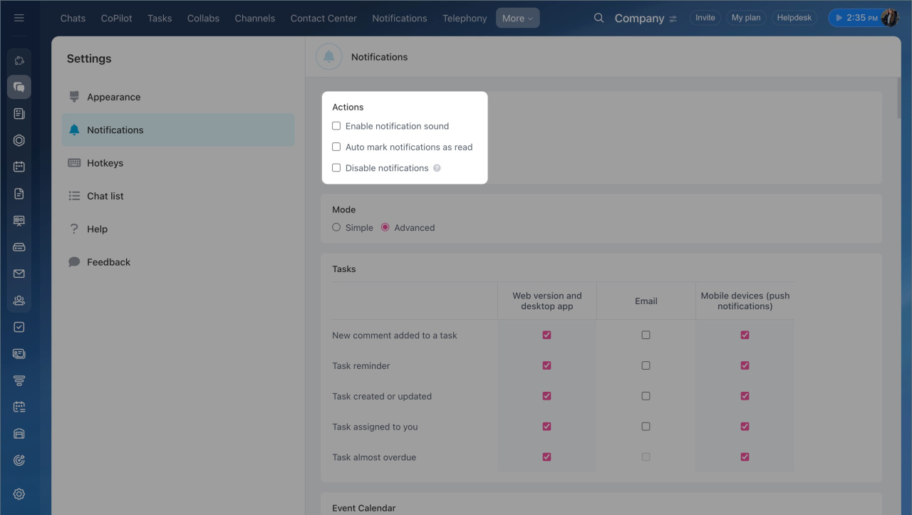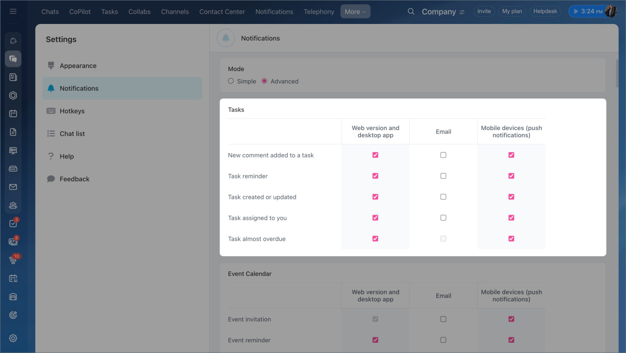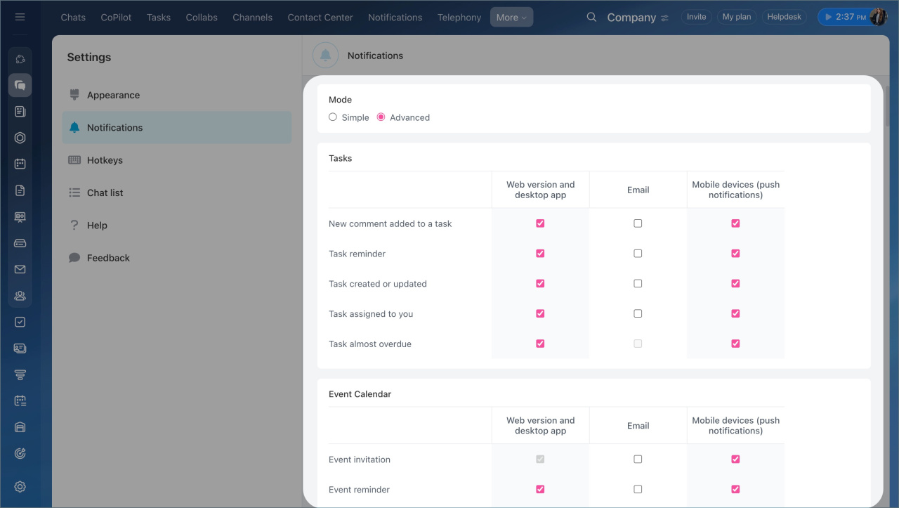 - Advanced — notifications can be customized for each Bitrix24 tool individually.