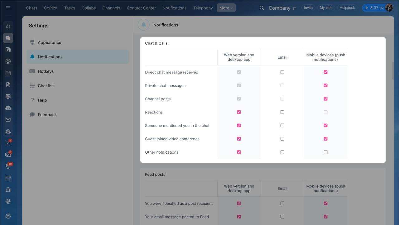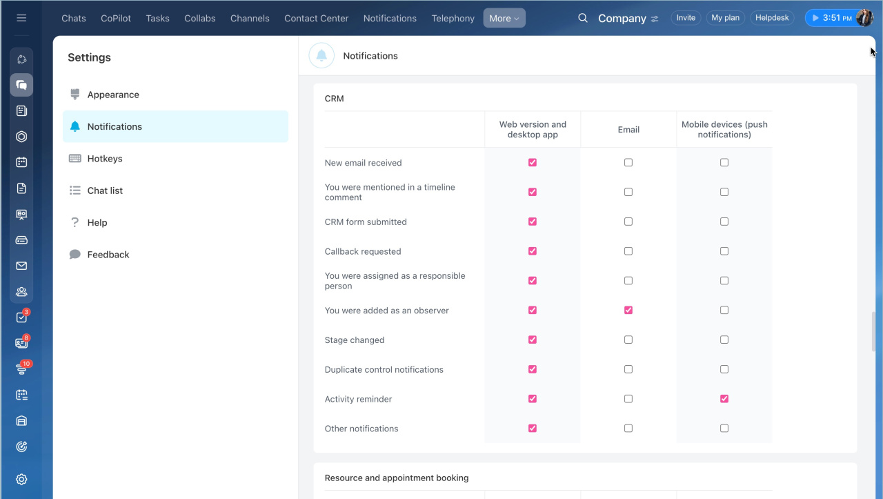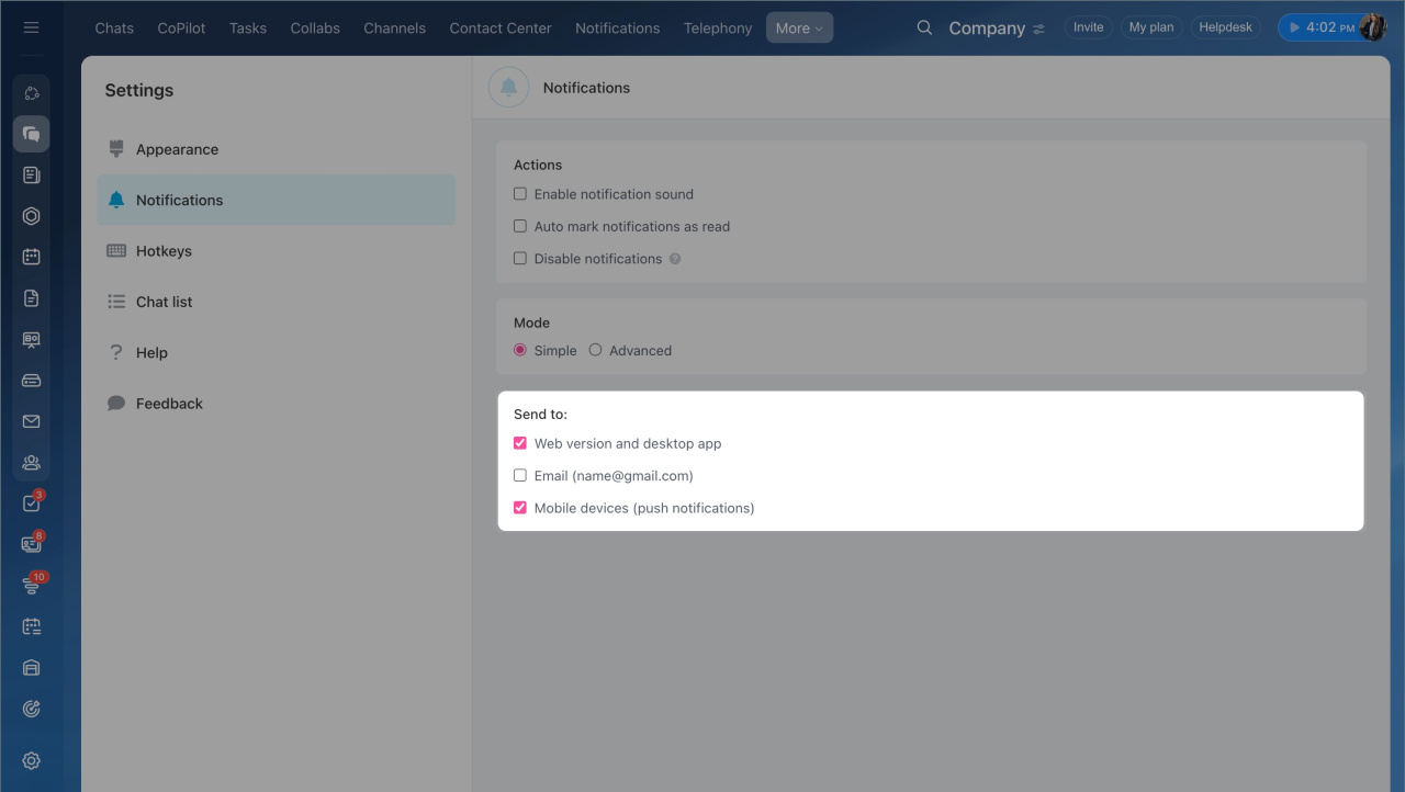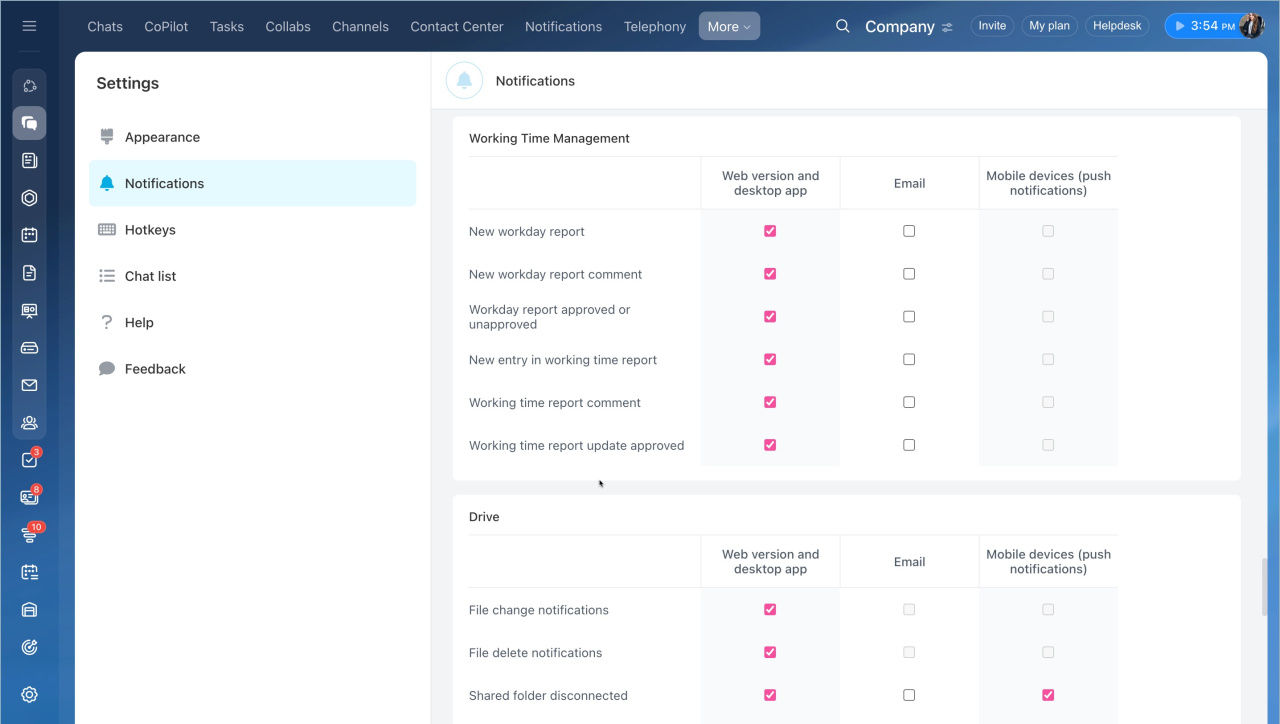 You can customize notifications to suit your needs by selecting which events to receive and where to see them: in the messenger, via email, or in the mobile app. For example, you can enable CRM notifications and disable task alerts.