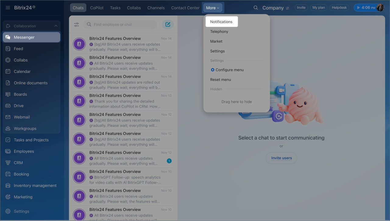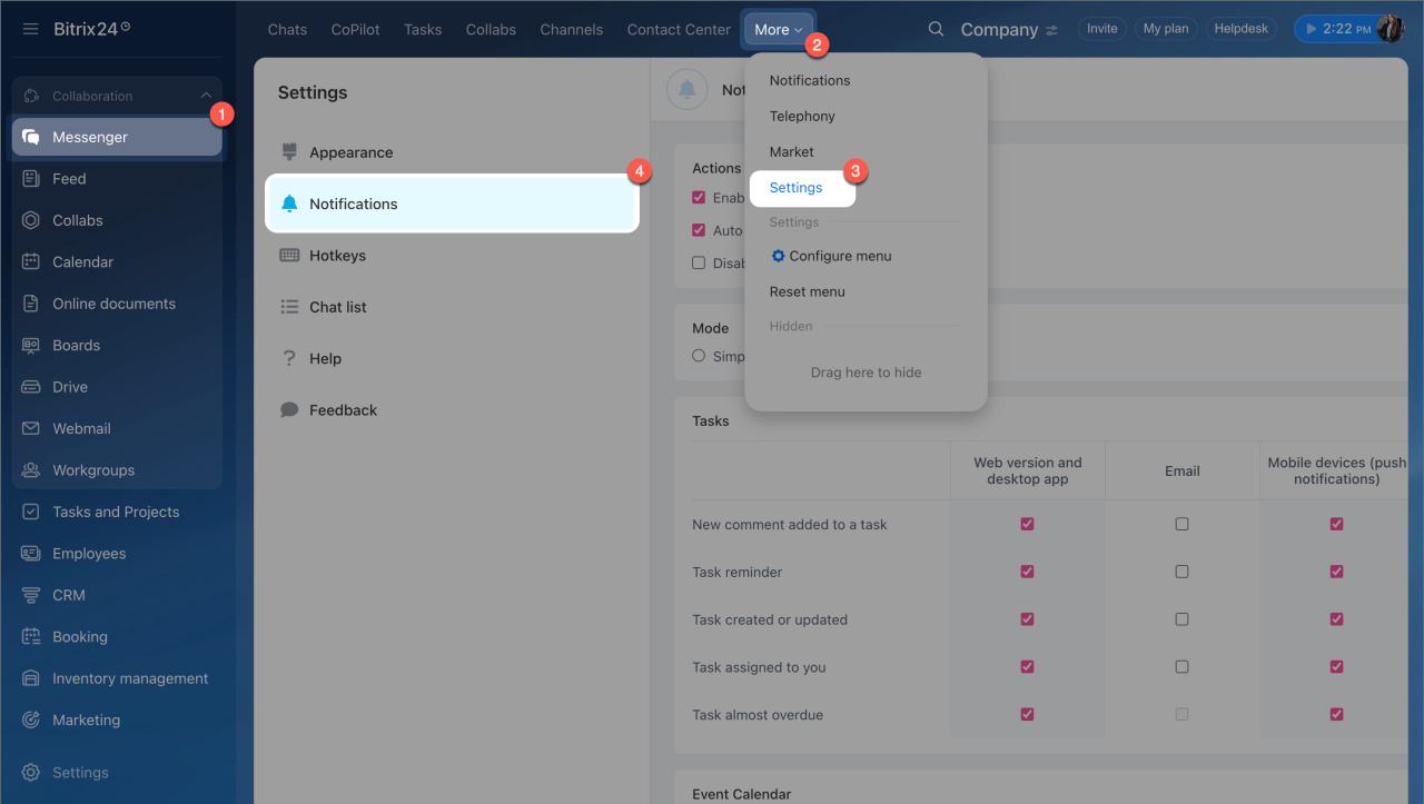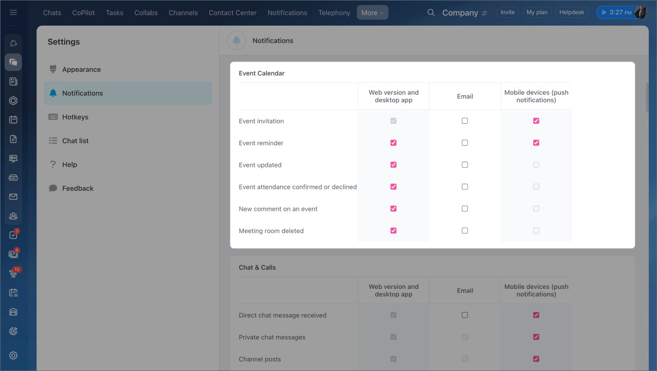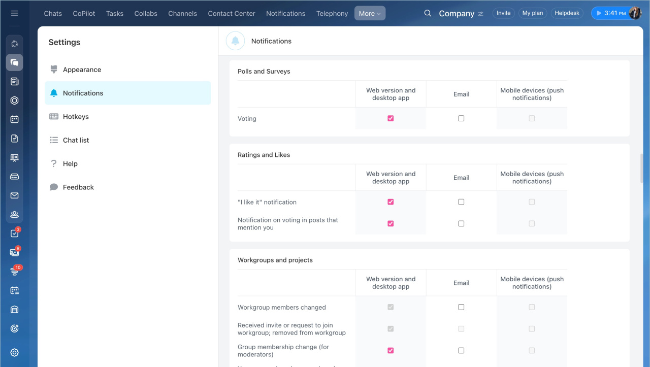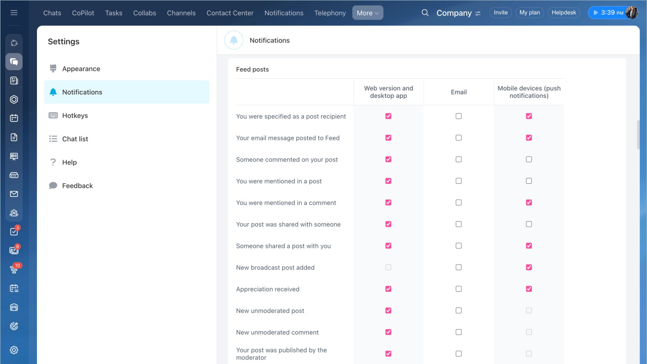 You can customize notifications to suit your needs by selecting which events to receive and where to see them: in the messenger, via email, or in the mobile app. For example, you can enable CRM notifications and disable task alerts.