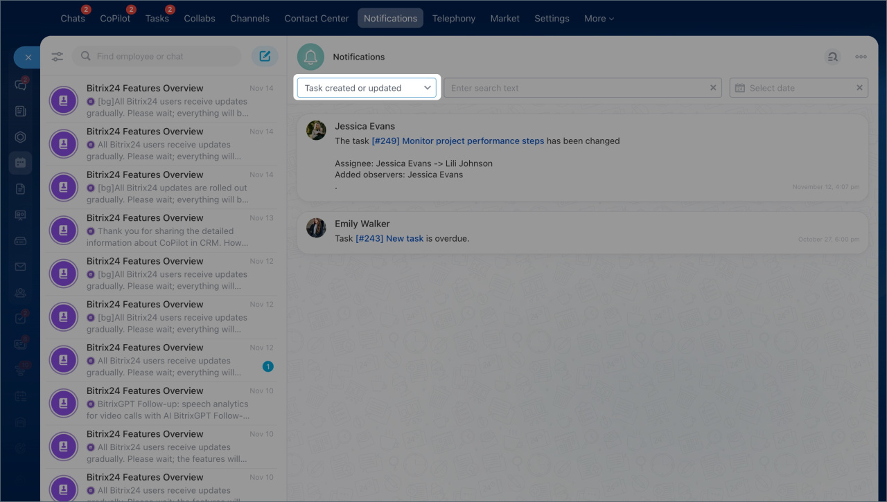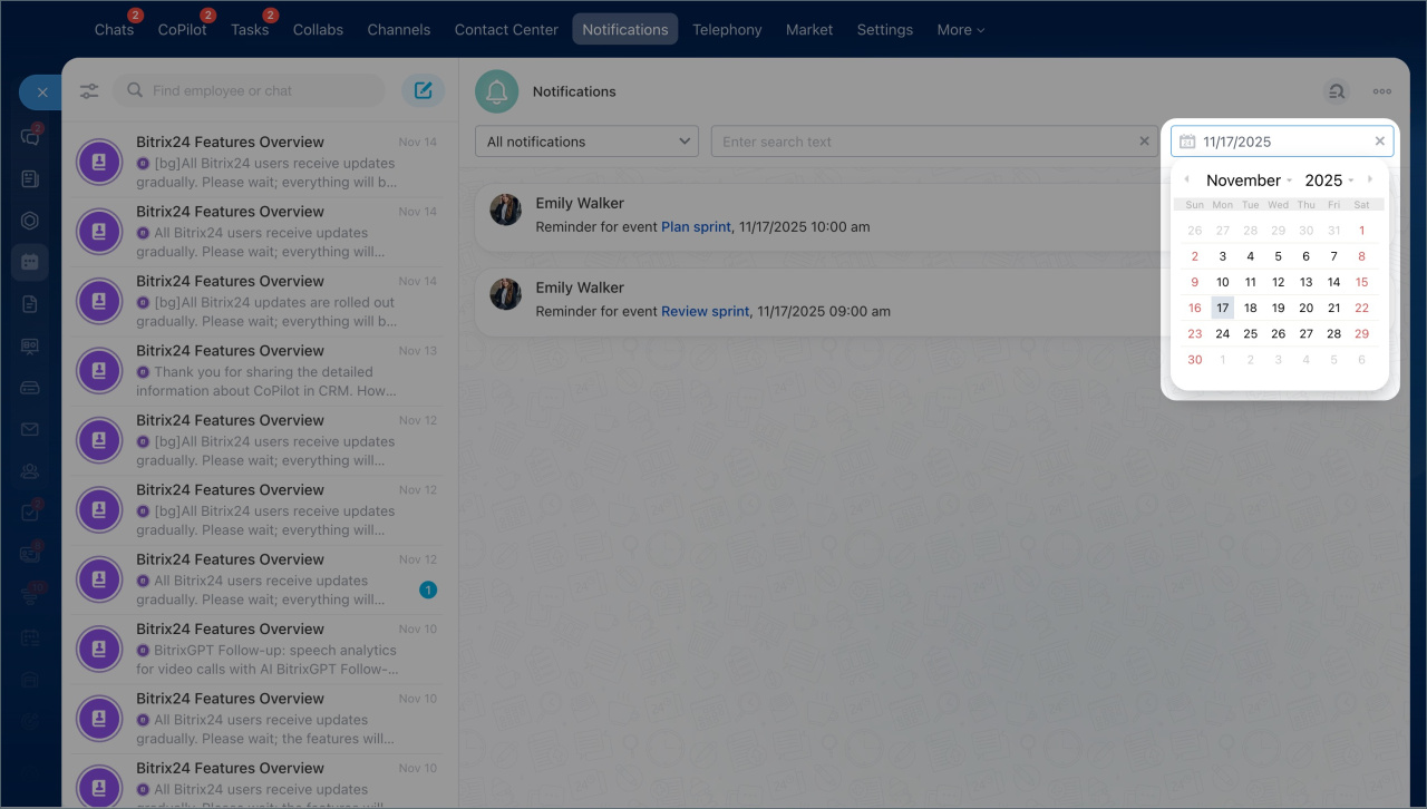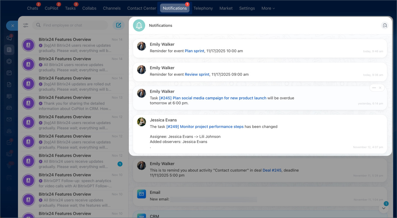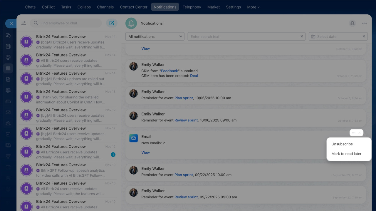 Notifications in Bitrix24 help you stay on top of important events like new tasks, comments, meetings, or CRM updates. Managing them is now easier with an updated interface and structure, plus the ability to quickly unsubscribe from unnecessary notifications.