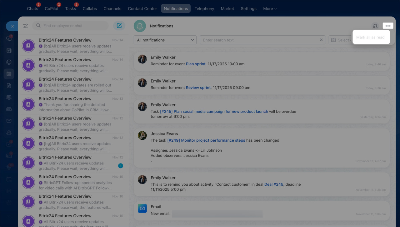 Mark all notifications as read. If you don't want to review each notification, mark them all at once. This is convenient when you handle events directly in Bitrix24 tools.