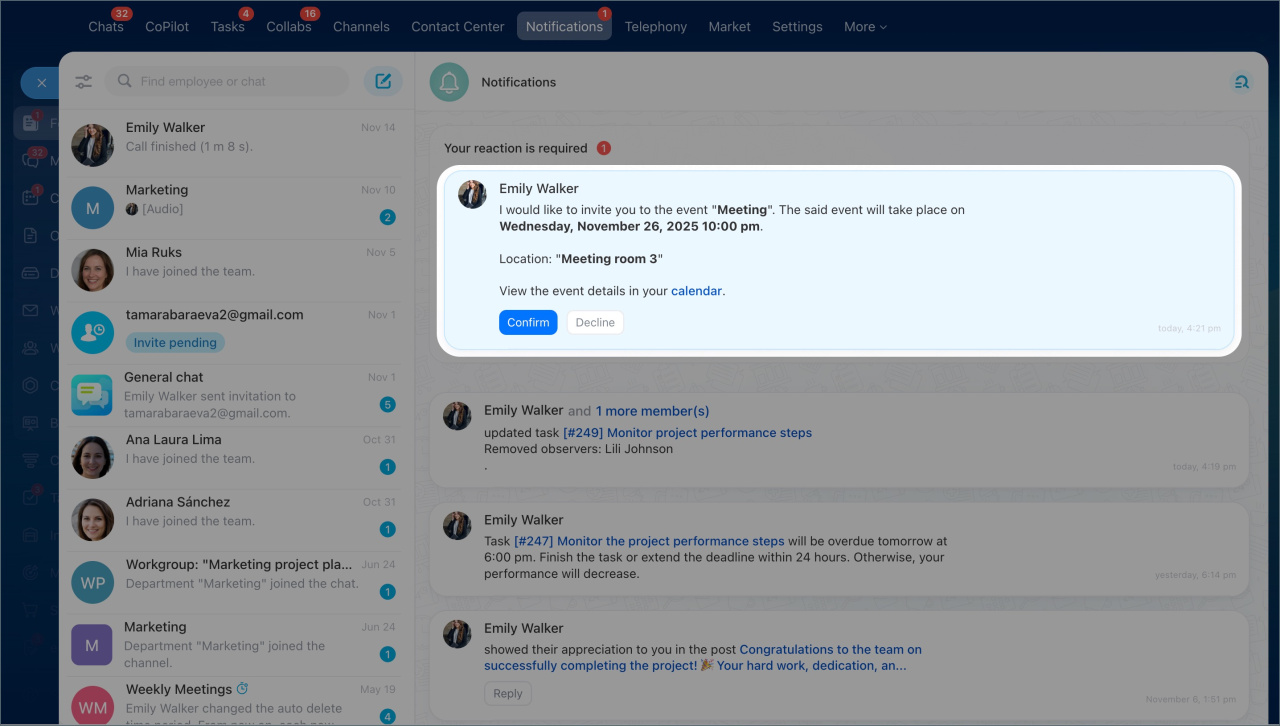 - Web version and desktop app — notifications will appear in the Bitrix24 Notifications section.