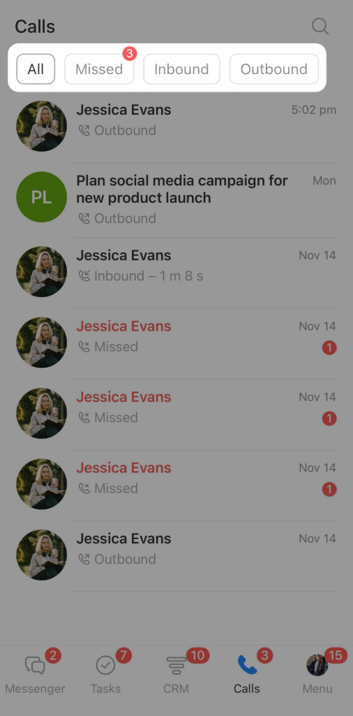 Call list in the mobile app. Incoming, outgoing, and missed calls are now available in one section. You can quickly call a colleague back directly from the app.
