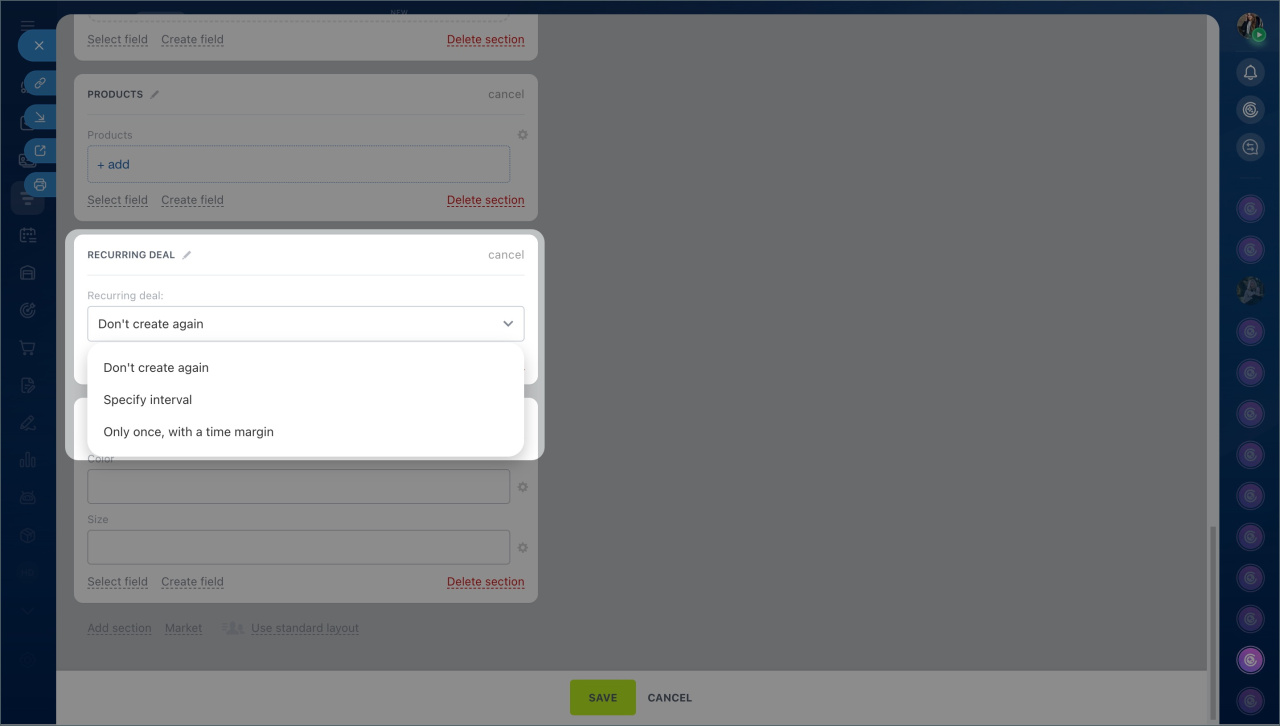 Recurring deals. They are convenient for working with regular customers, like for monthly services, rentals, or supplies. CRM creates these deals automatically based on the schedule you set. This helps you stay in touch with customers on time and reduces routine tasks.