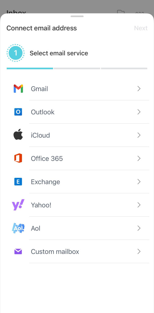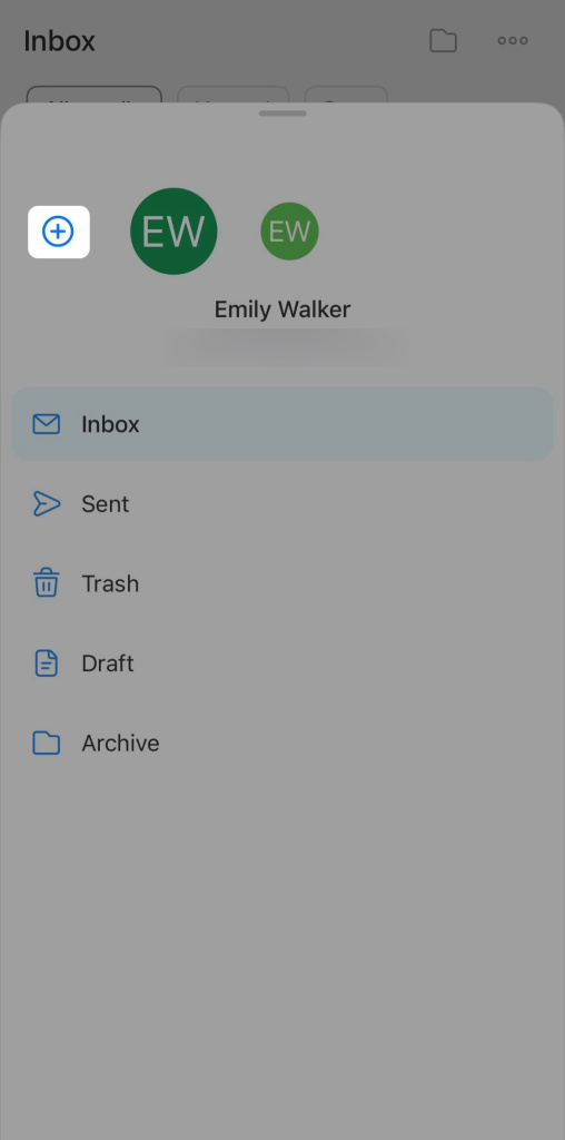 To connect another mailbox — tap the folder icon and click Plus (+).