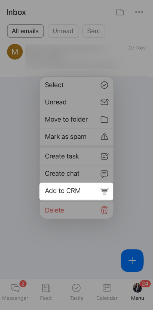 Tap and hold the desired email, then select an action. For example, add it to CRM. Emails linked to CRM will display a CRM label, allowing you to quickly access the related form.