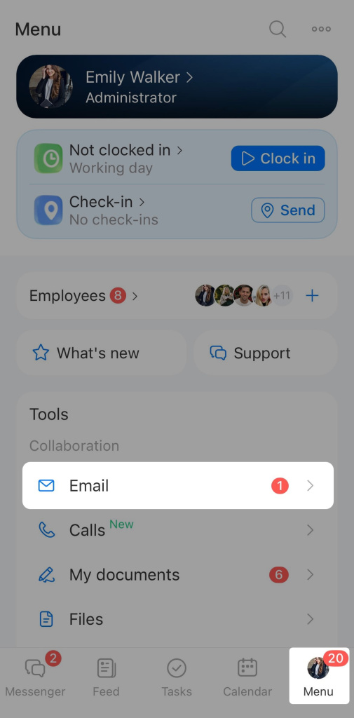 In the Bitrix24 mobile app, you can connect your email and manage emails just like on a computer. Read and send emails, forward them to colleagues, create tasks, link them to CRM, and more. This is convenient if you often work outside the office and want to quickly respond to emails from customers, colleagues, or partners.
