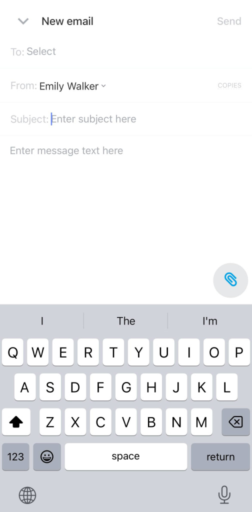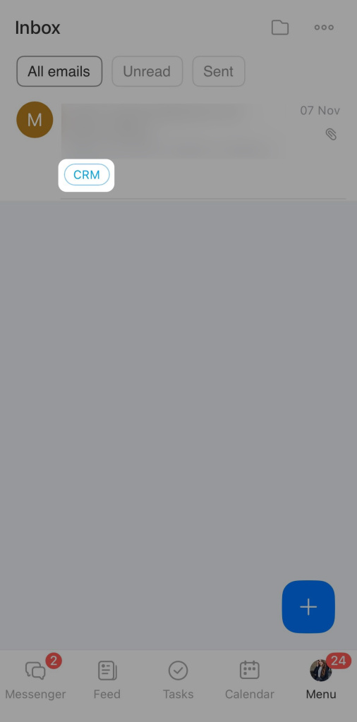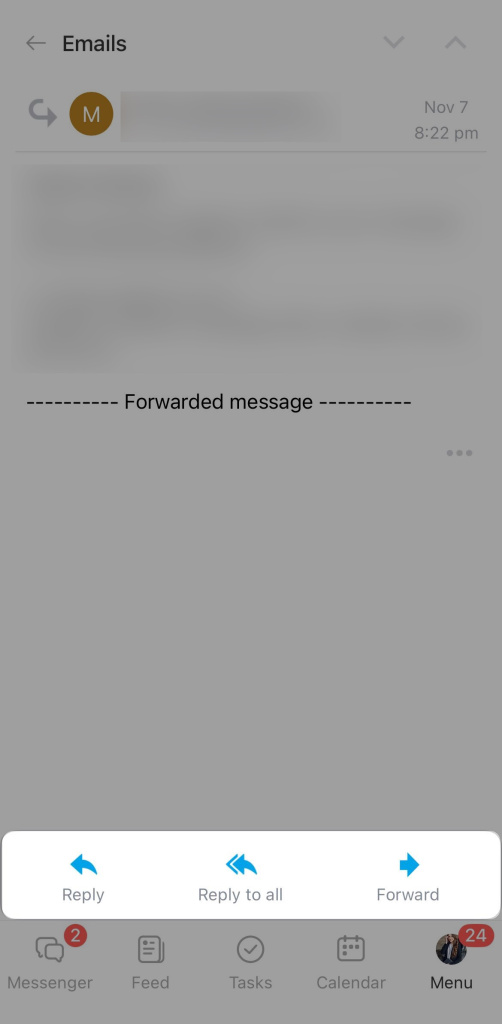 - After connecting your email in the mobile app, you can perform all basic actions with emails: read, reply, forward, create tasks, events, CRM forms, etc.