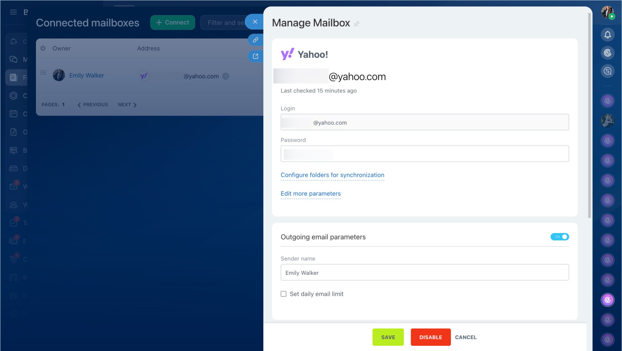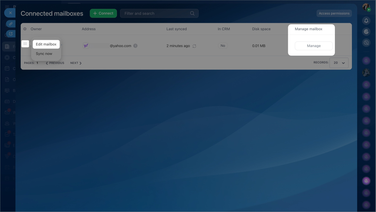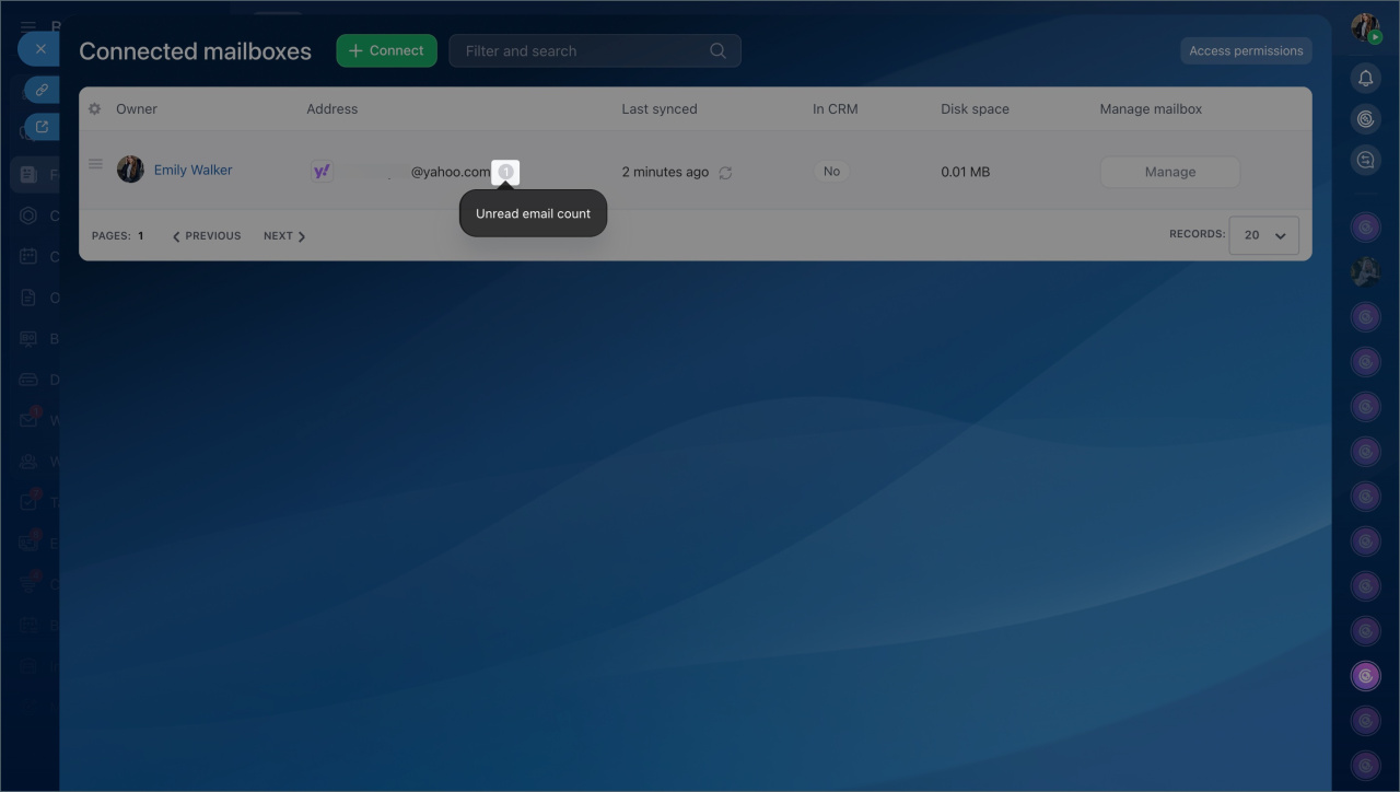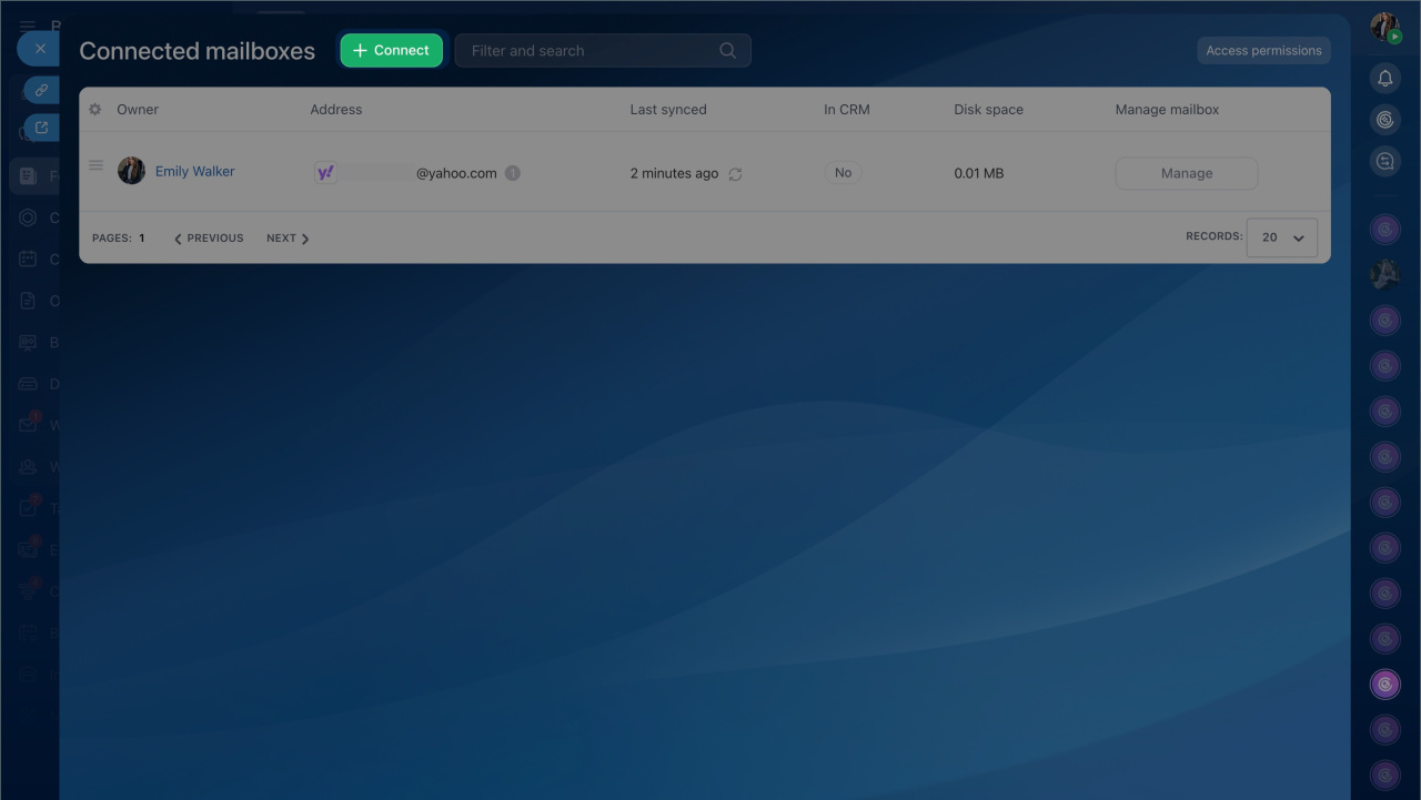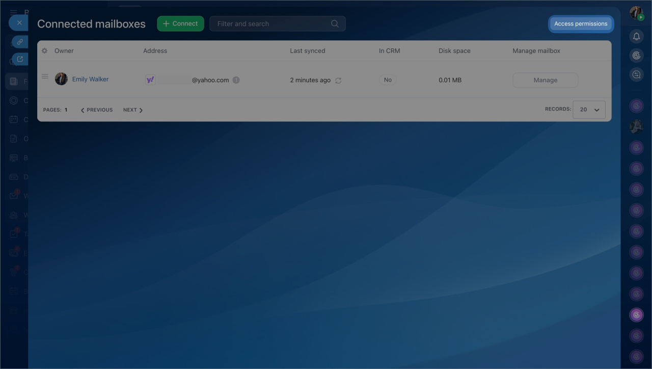 In Bitrix24, you can centrally manage employee mailboxes: view the list of connected mailboxes, add new ones, configure access permissions, and check if the mailbox is linked to CRM.