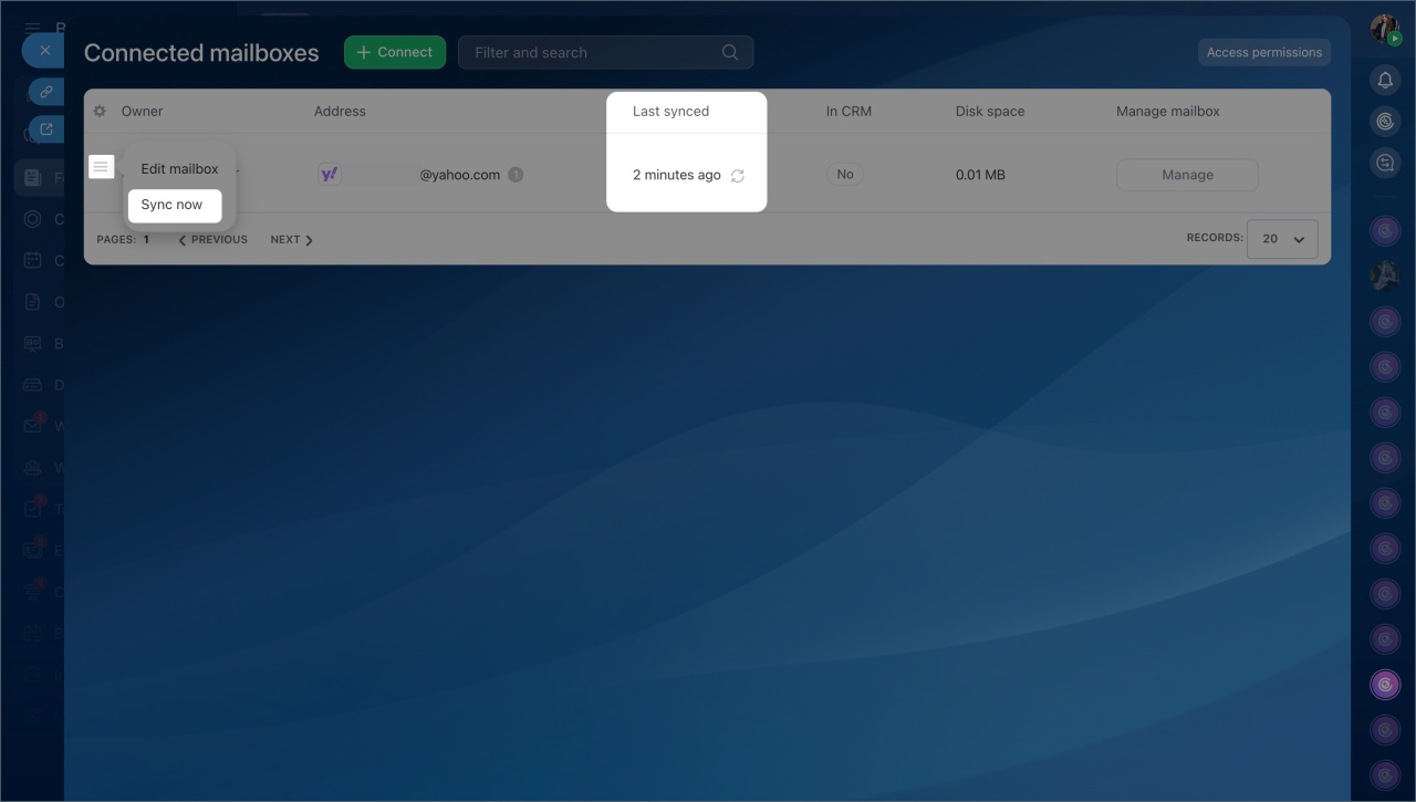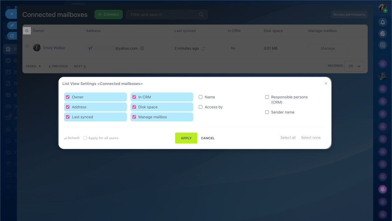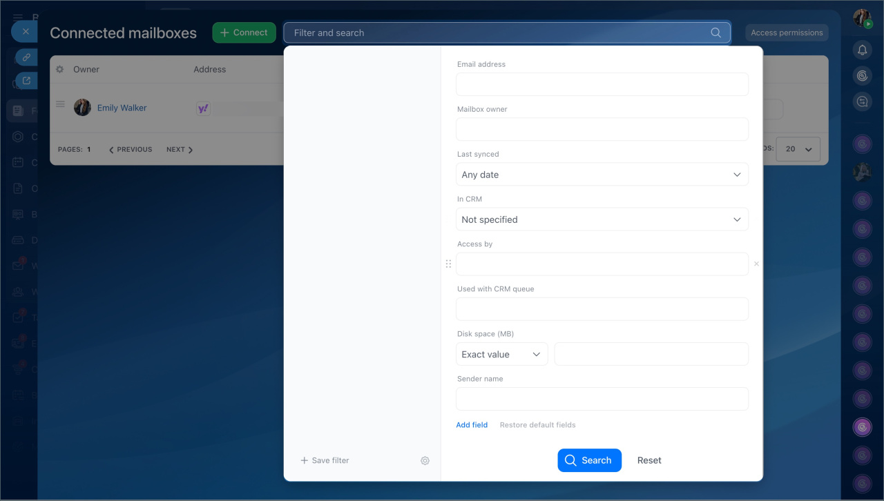 If the company has many connected mailboxes, searching manually can be inconvenient. Filters help quickly find data without scrolling through the entire list. For example, you can display only mailboxes integrated with CRM or those that haven't been synchronized for a long time.