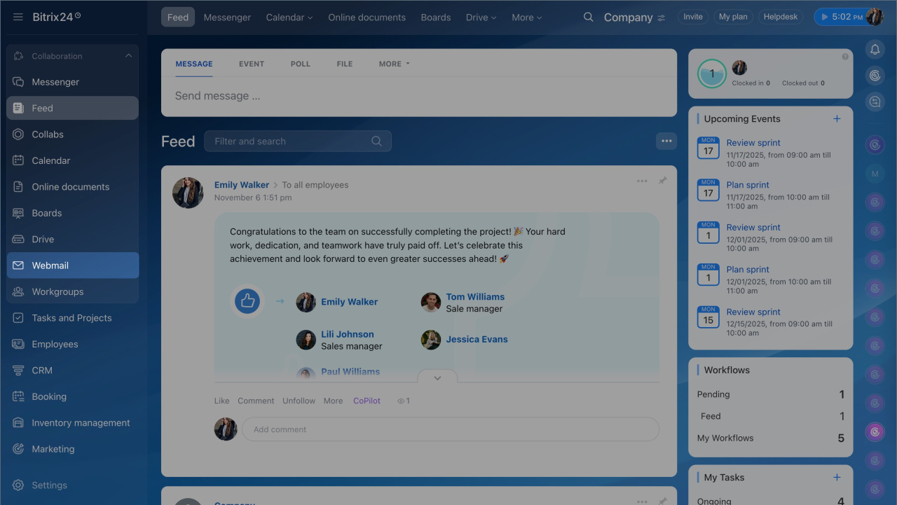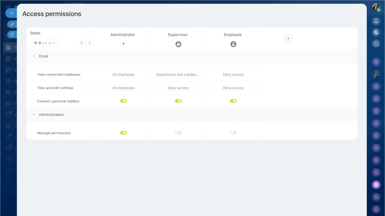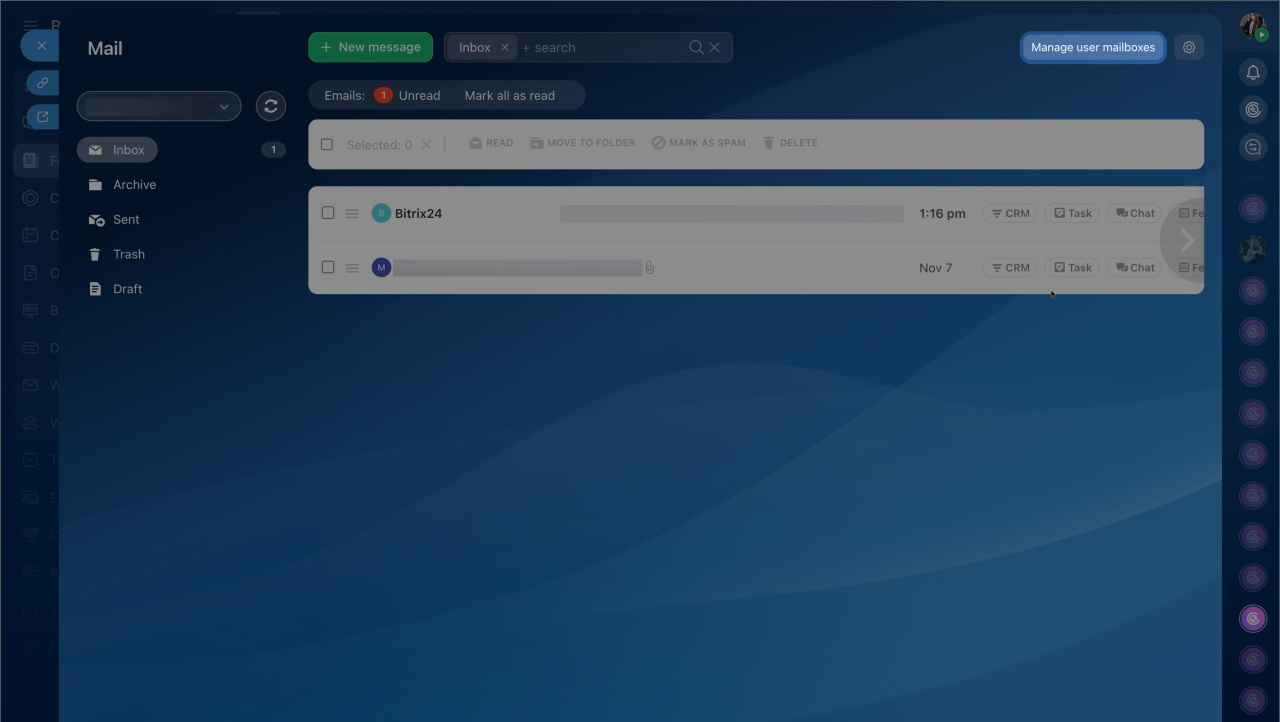 - In Bitrix24, you can centrally manage employee mailboxes: view the list of connected mailboxes, add new ones, configure access permissions, check if the mailbox is linked to CRM, and more.