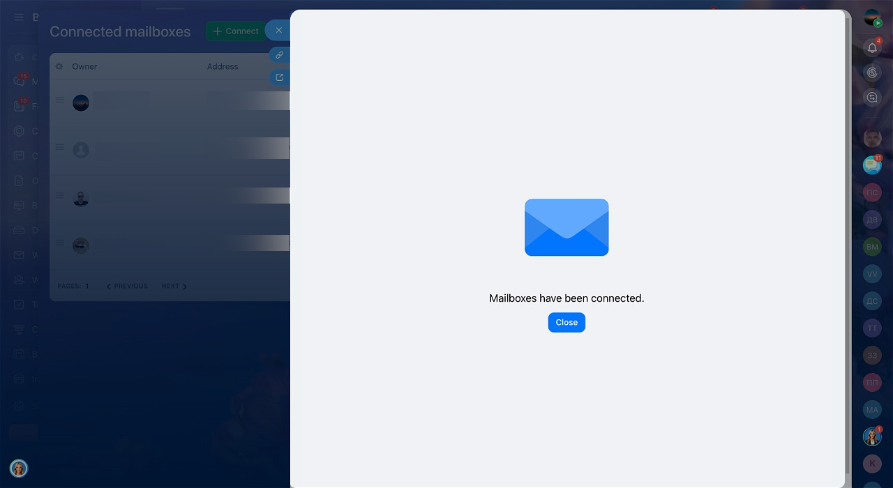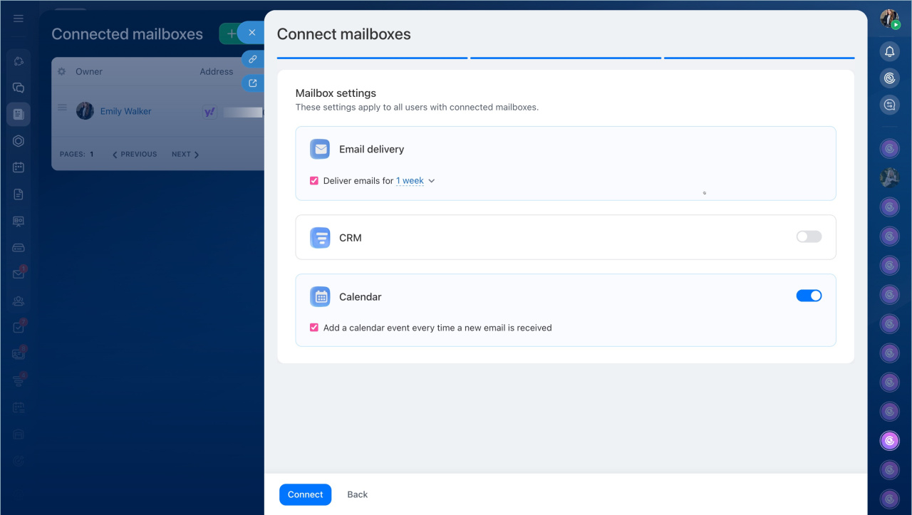 - Before connecting mailboxes, configure them by selecting the email loading period, enabling CRM integration, and setting up calendar integration.
