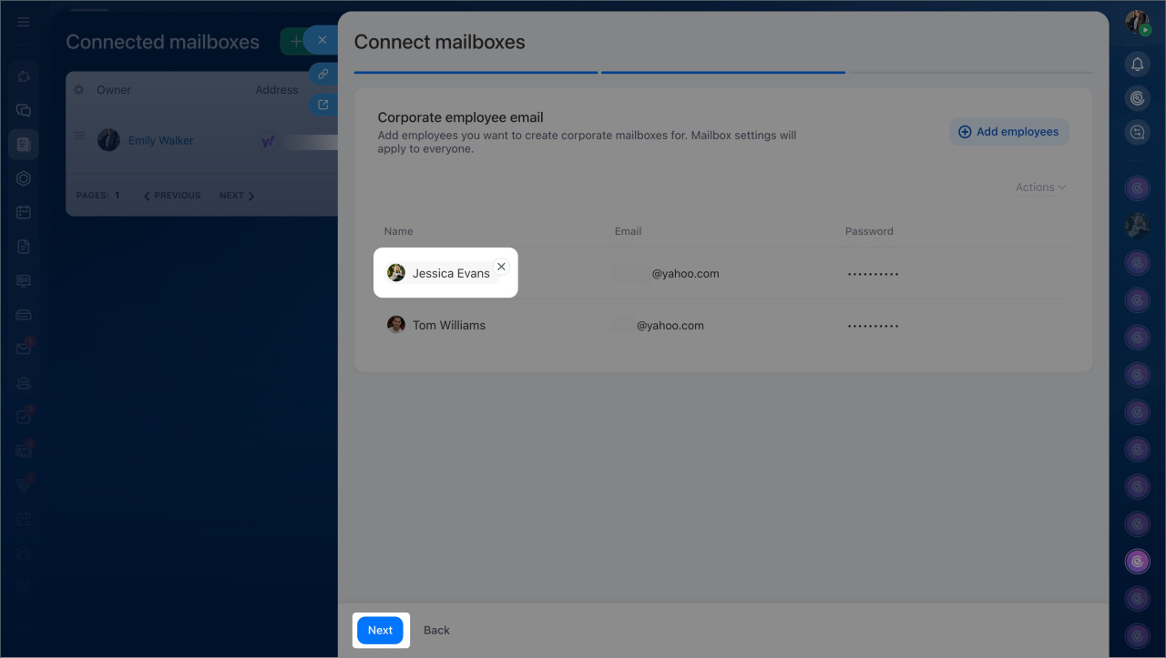 - Click Add employees and select the employees you want to connect to corporate email. Click Next.