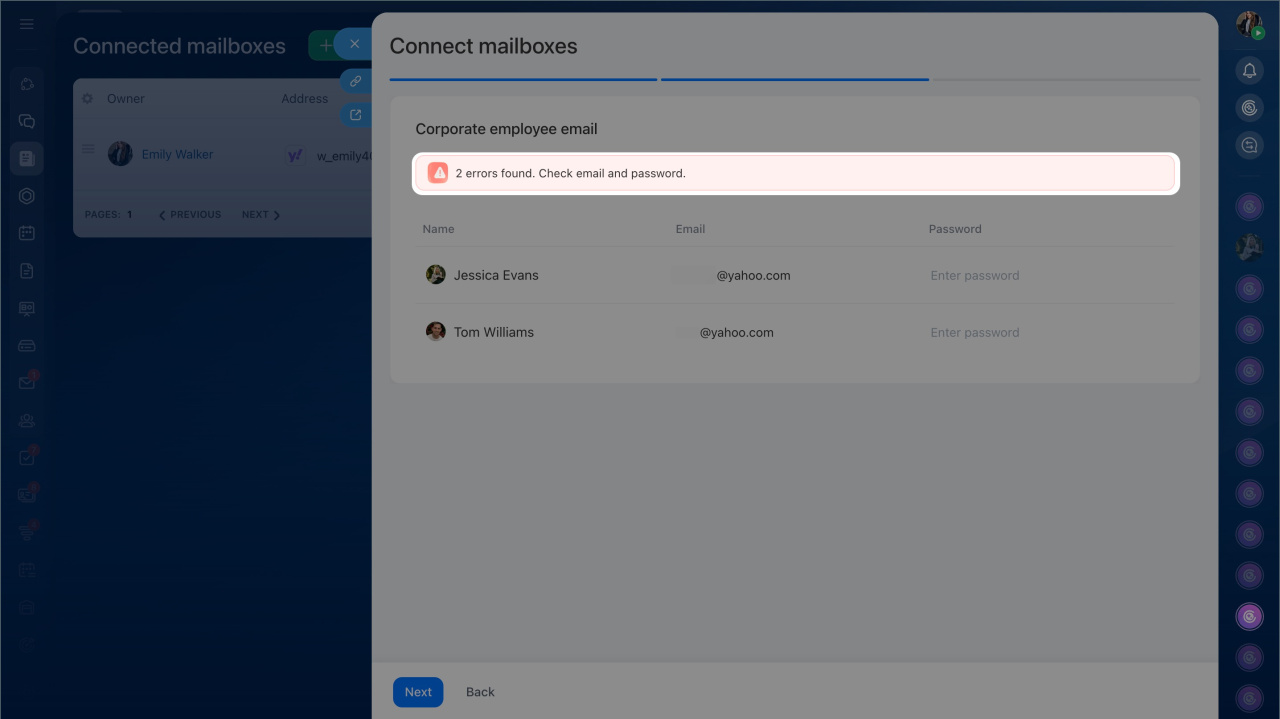 If errors occur during connection, Bitrix24 will indicate which employees’ mailboxes failed to connect. You can quickly correct the data and retry the connection without reconfiguring the entire list.