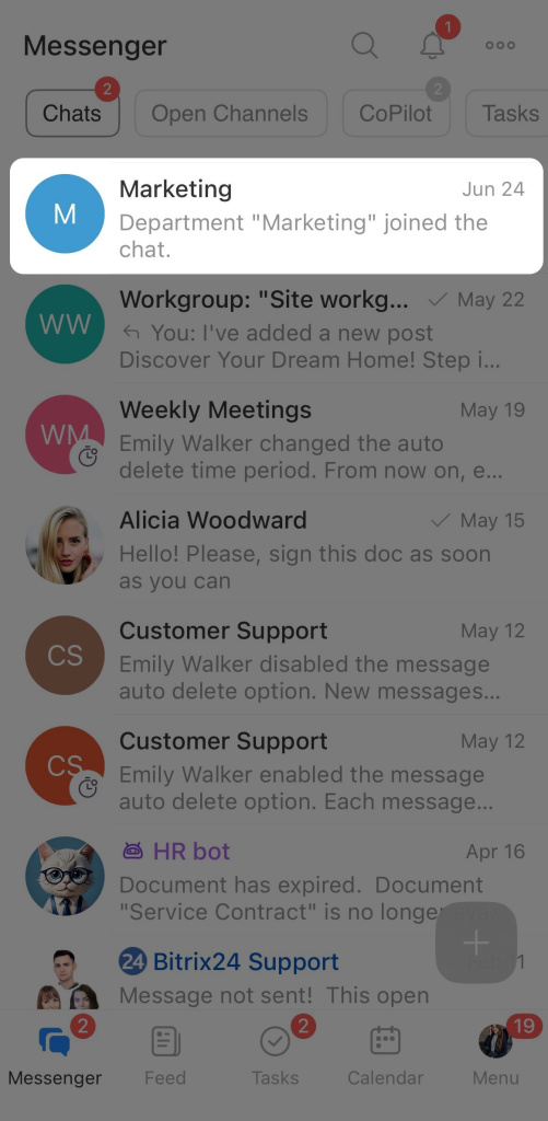 After the task is created, a notification will appear in the chat, indicating that CoPilot has created it. You can open the task and configure additional tools: specify participants, add files, and more.
