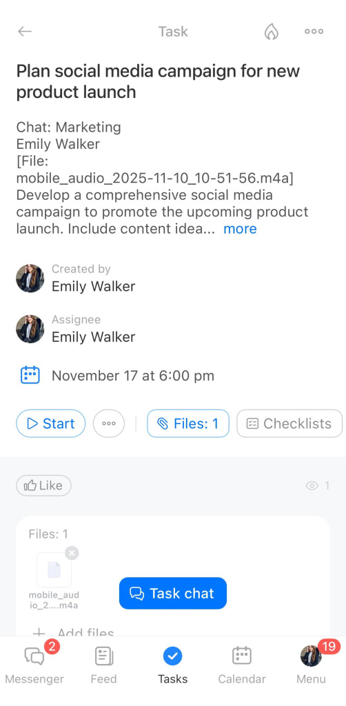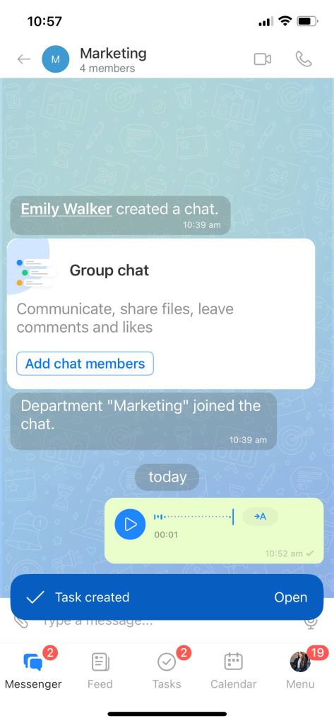 Assignments are no longer lost in chats. Everything you say in voice or video messages is captured in tasks, helping the team stay on track.