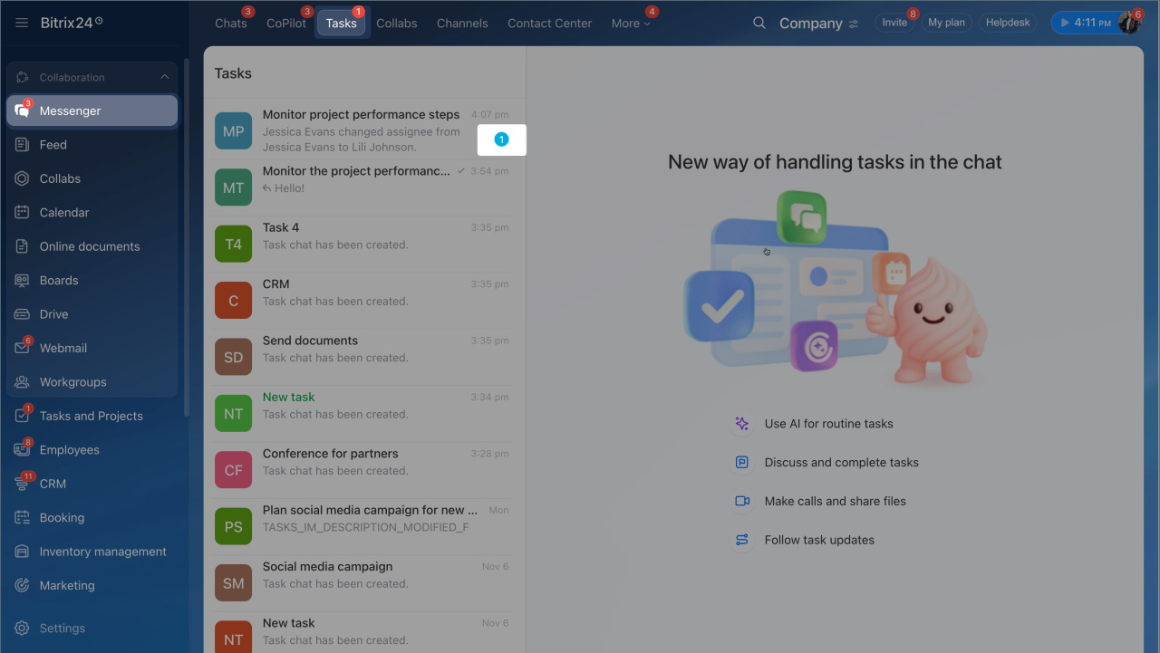 - Monitor counters in the "Tasks and Projects" section or the messenger’s "Tasks" tab. They show the total number of new events and highlight tasks with updates.