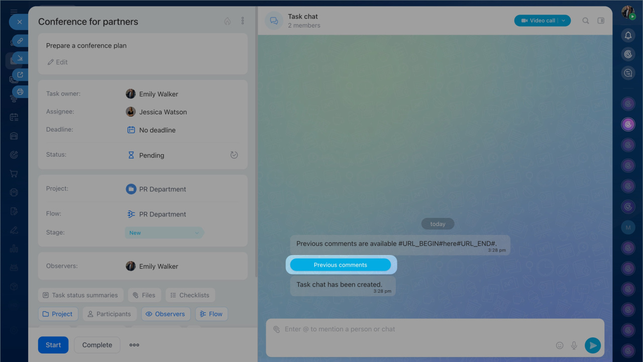 - Quickly access the needed task — all active tasks you are involved in are gathered in one list. Chats with new messages move to the top like in a messenger, so it’s clear where your input is needed. To open the task itself, click the link in the chat header.