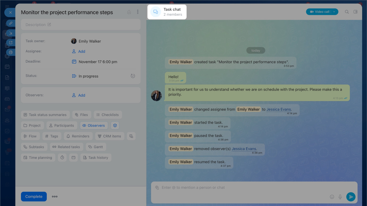 - Track changes — every step is recorded in the chat: deadline changes or status updates. This allows you to quickly monitor what has changed and the task’s current stage.
