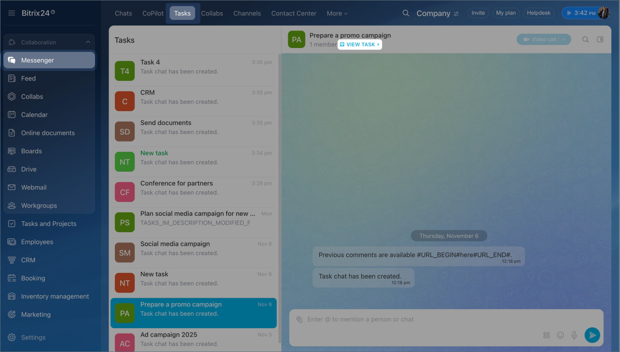 We have restructured tasks in Bitrix24 to fit this format. Now, a task is not just a form with fields and comments but a unified space where all the work happens: discussions, actions, and results. The task chat has become the center of communication and process management: the team makes calls, exchanges files, and makes decisions without losing context or wasting time switching between tools.