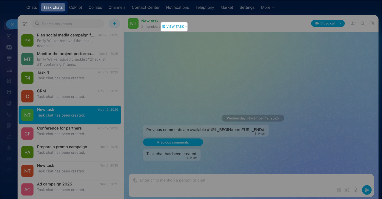 You can access the task chat list in the Tasks and Projects or the Messenger section under Task chats. To open a specific task, click the link in the chat header.