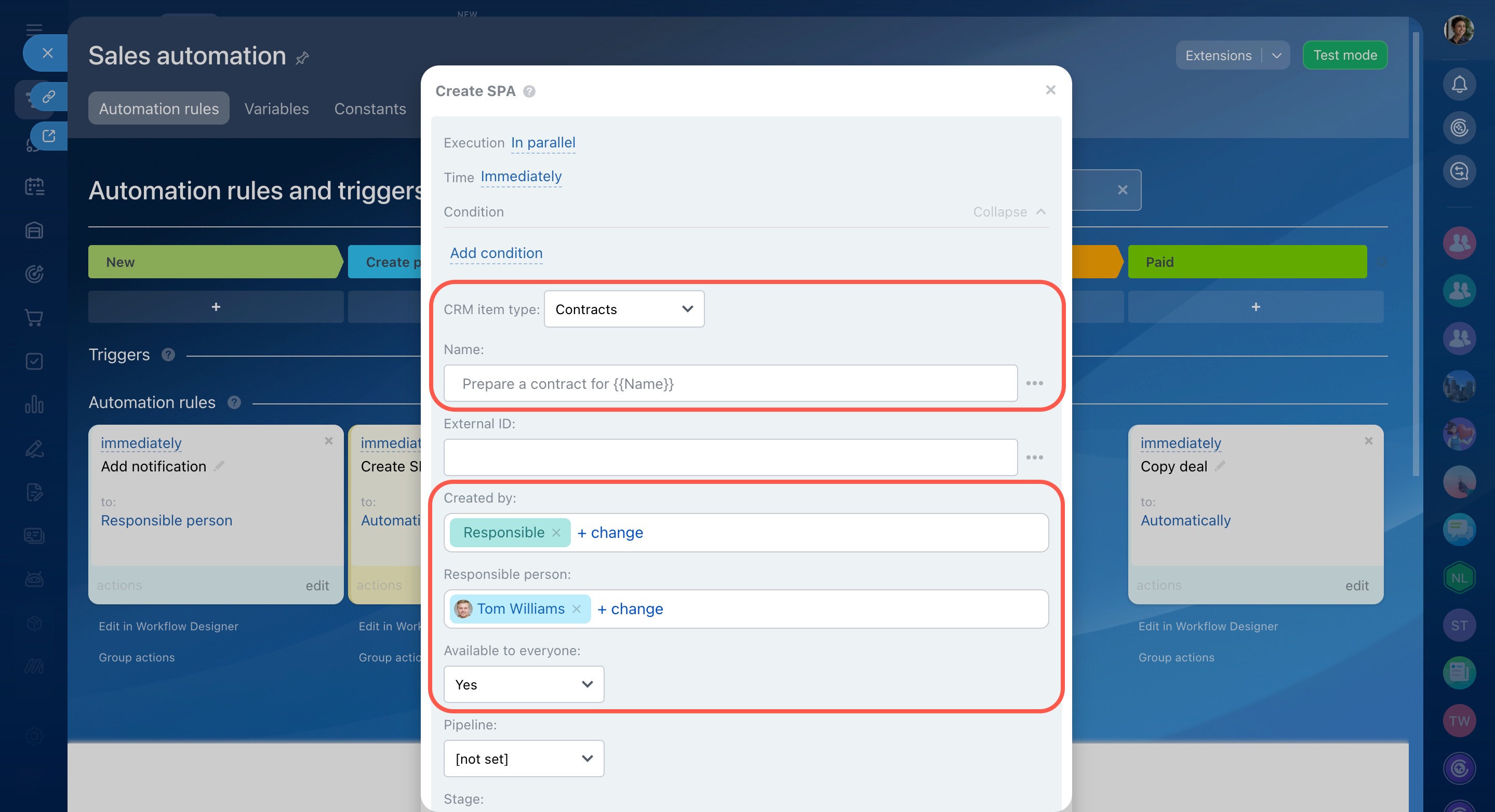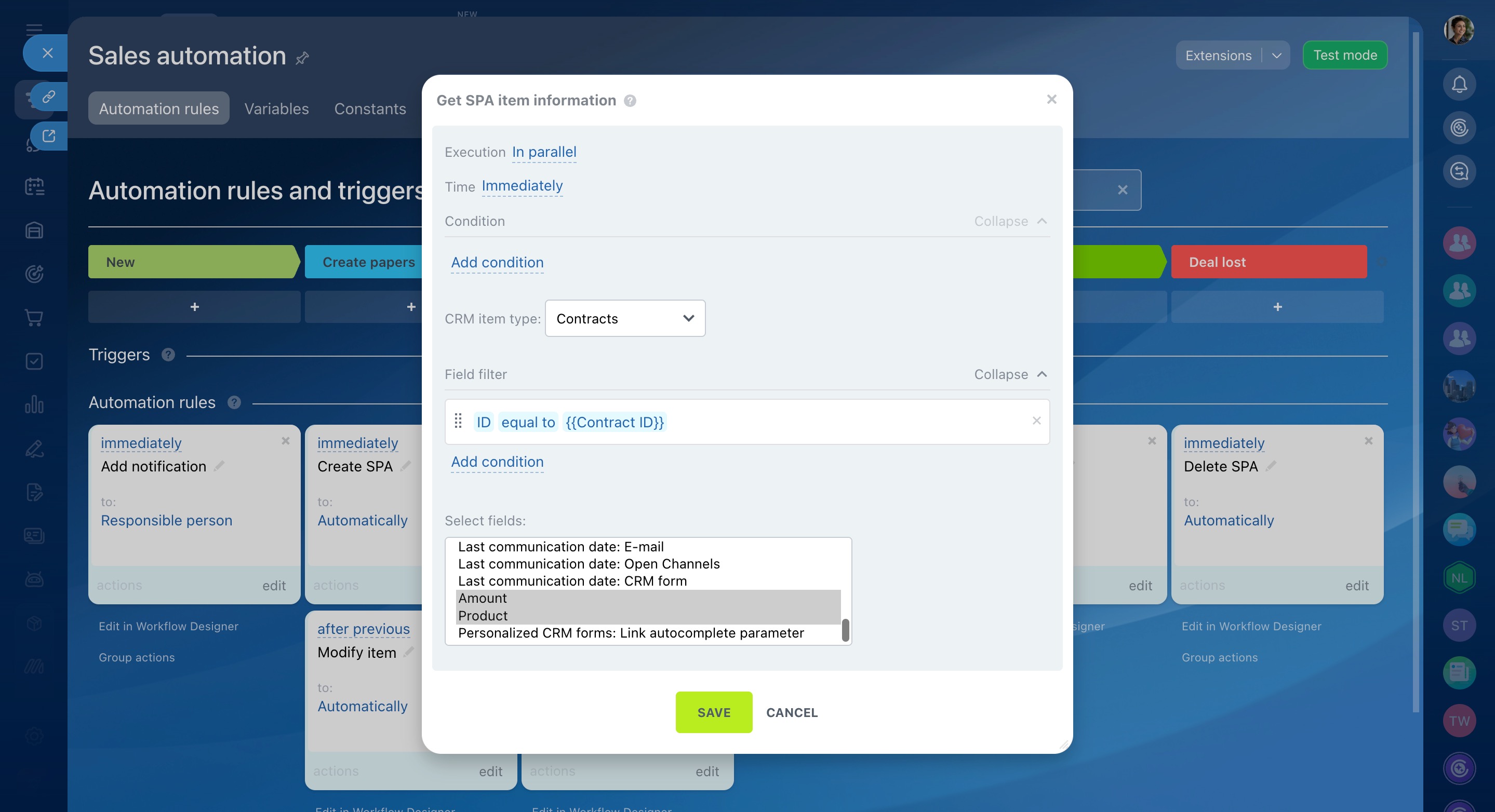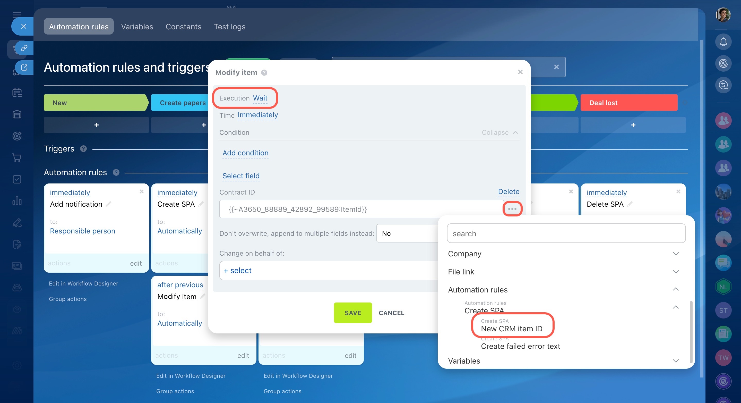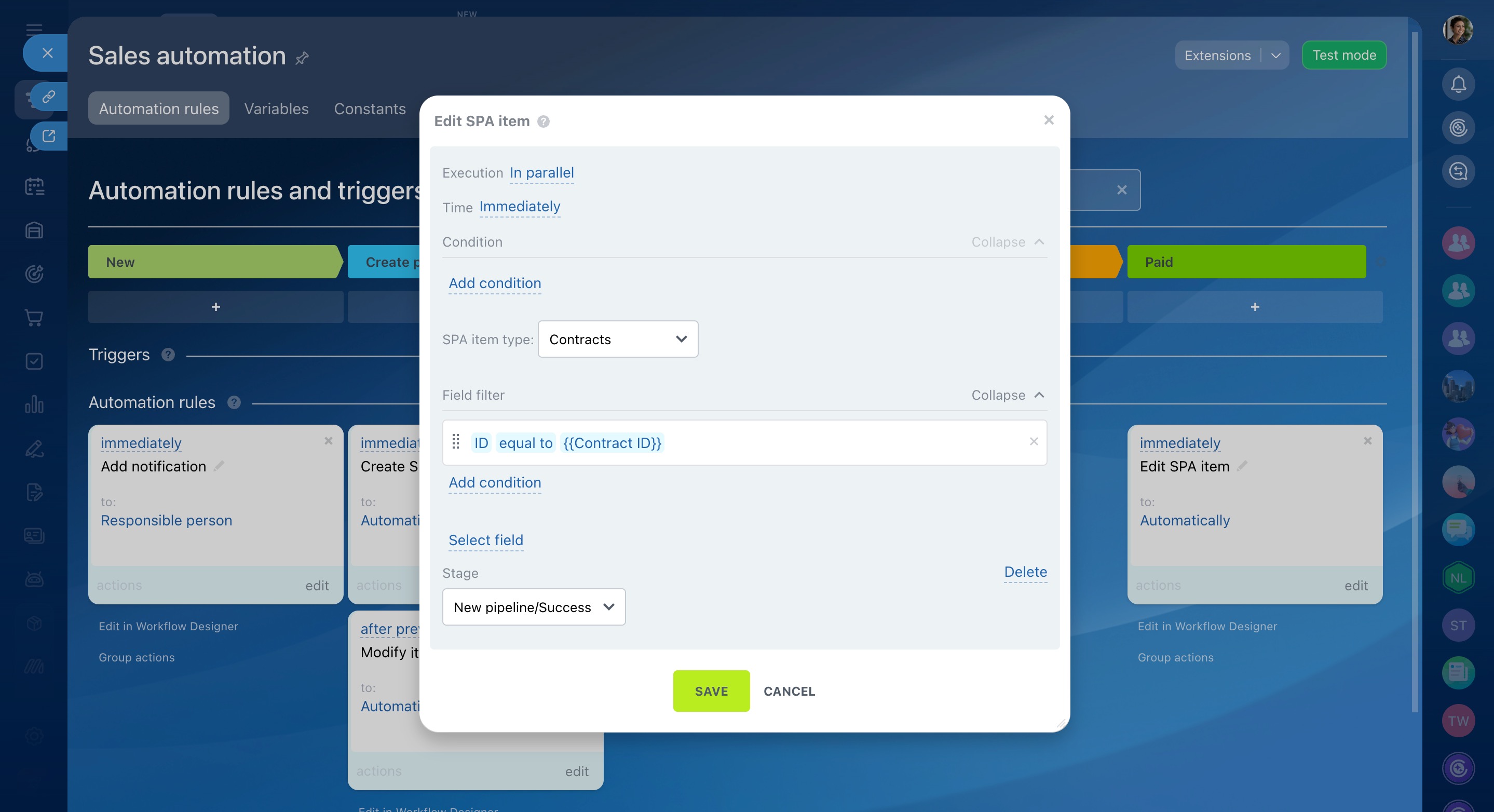 The automation rule changes the SPA item fields. You can use it to automatically add observers, assign another responsible person, or change the stage. For example, when a deal reaches a successful stage, the corresponding SPA item is also moved to a successful stage. This setup is beneficial when both the deal and the SPA item need to be completed at the same time.