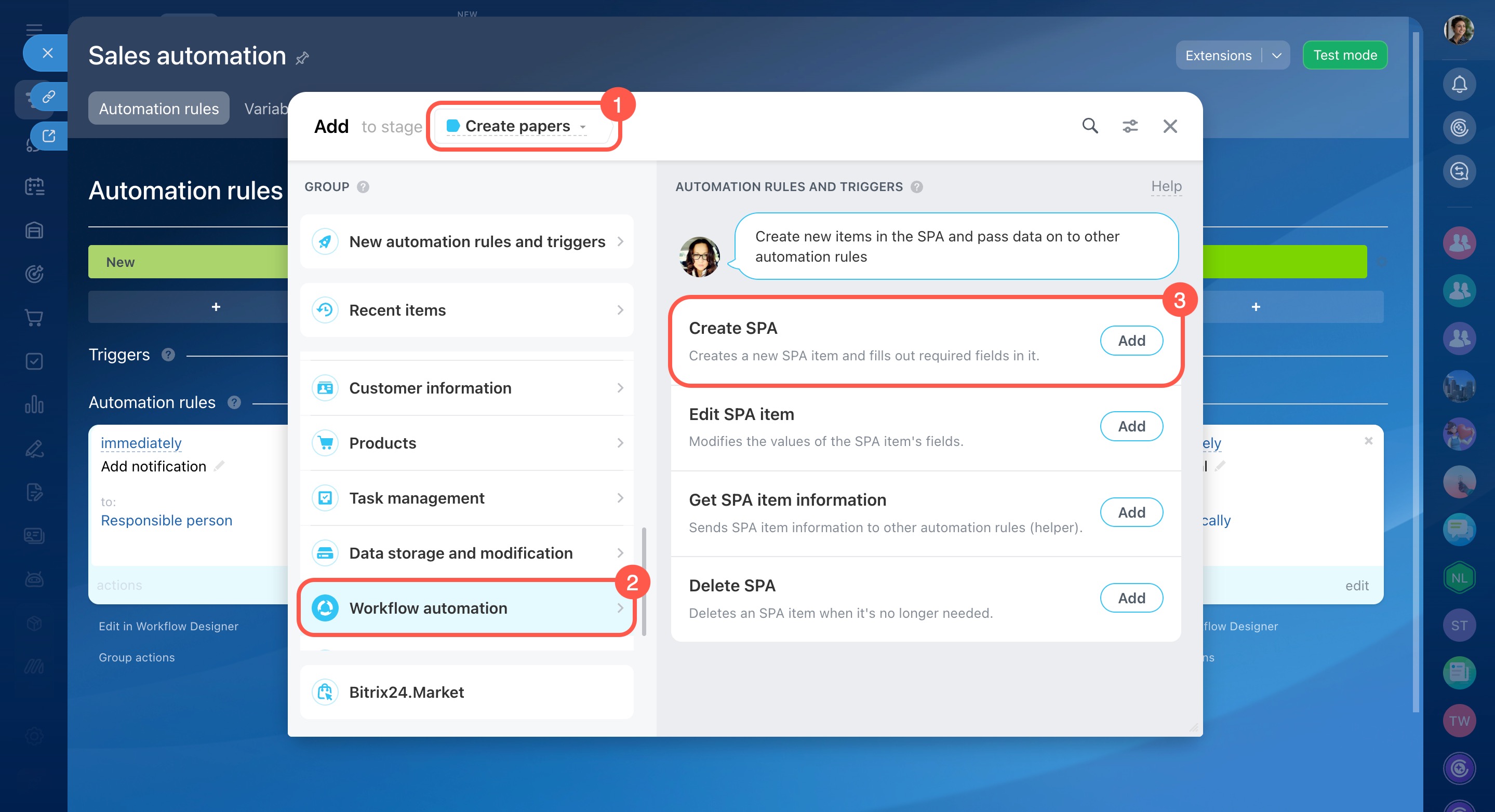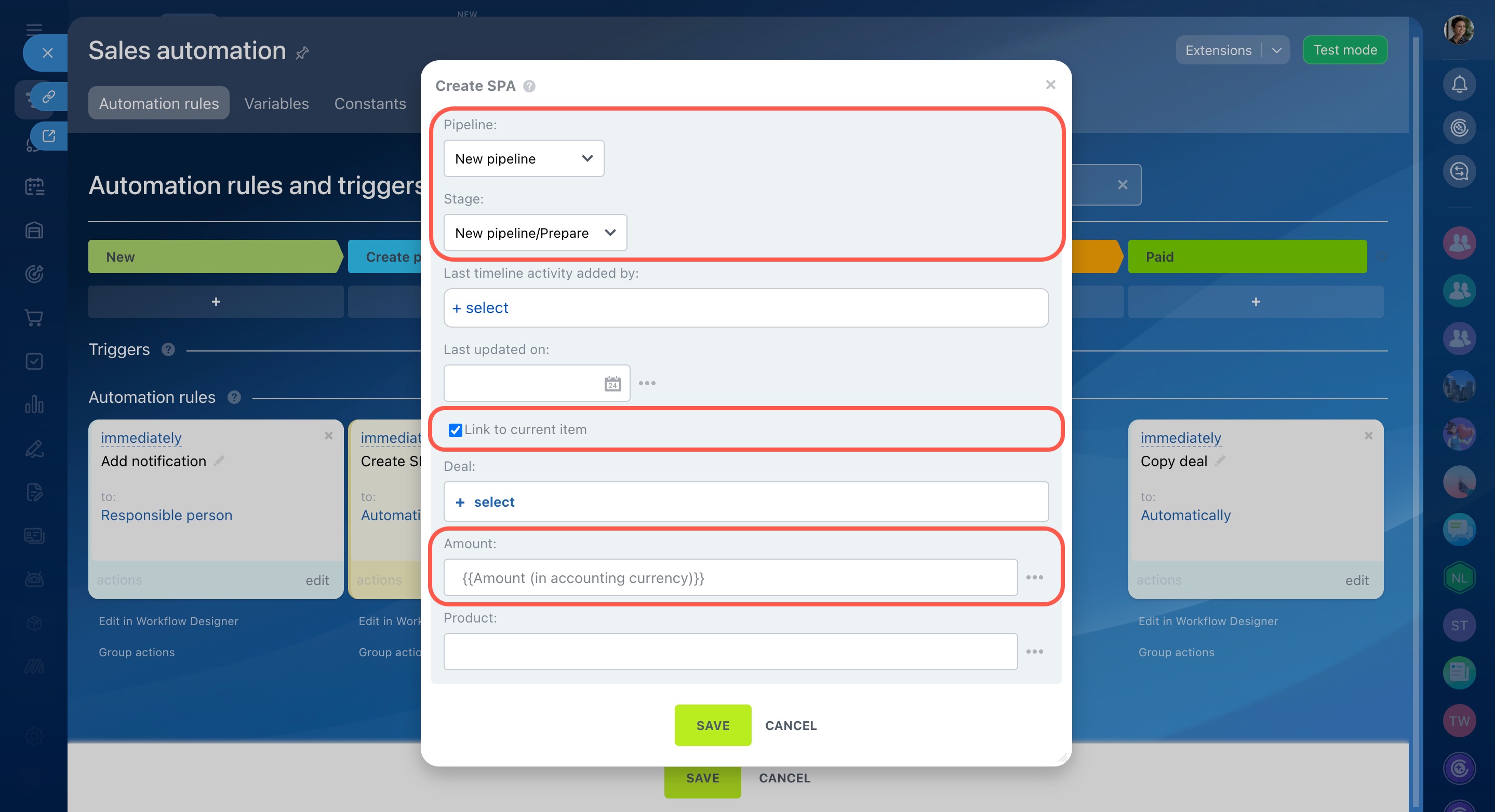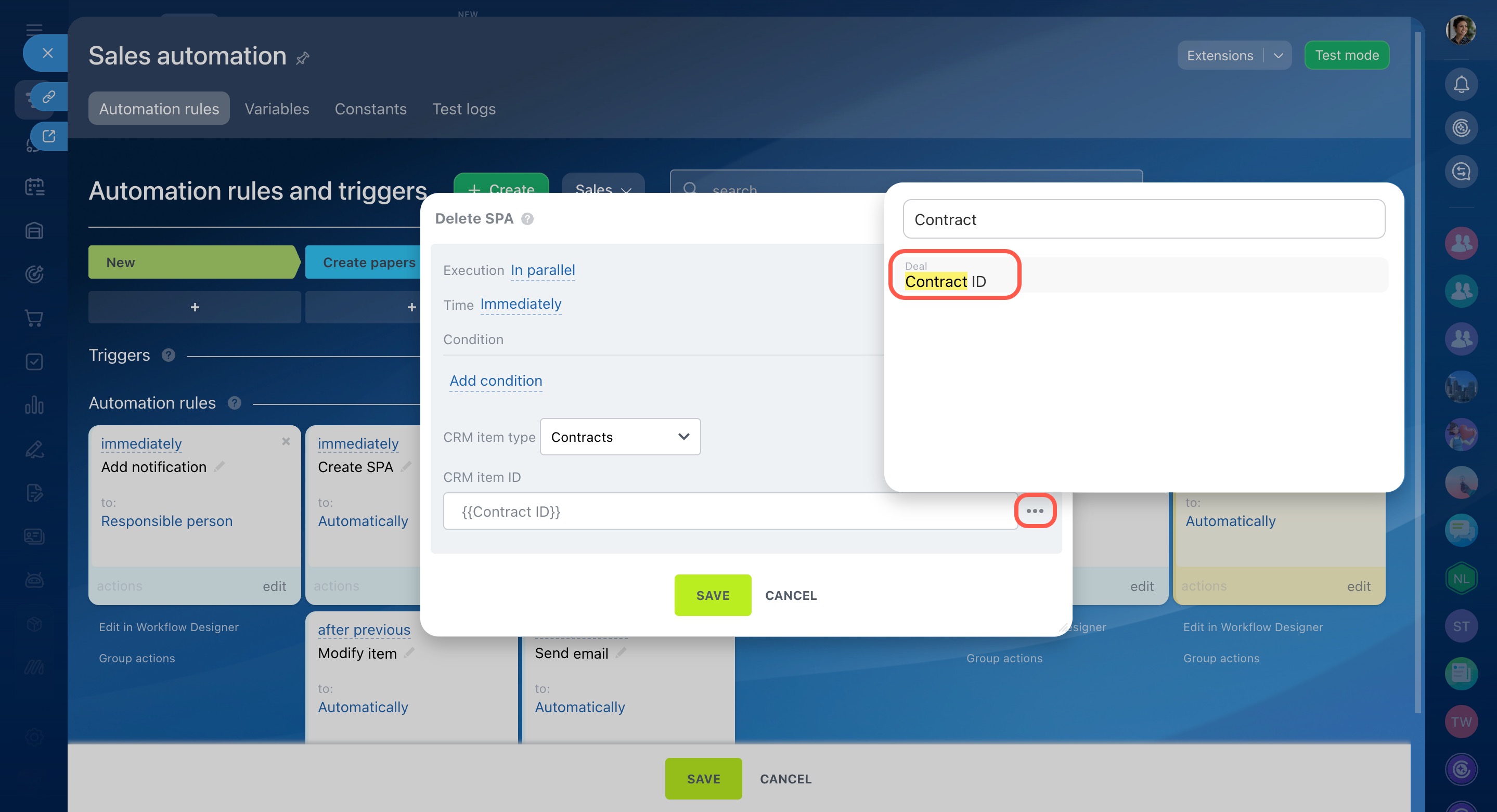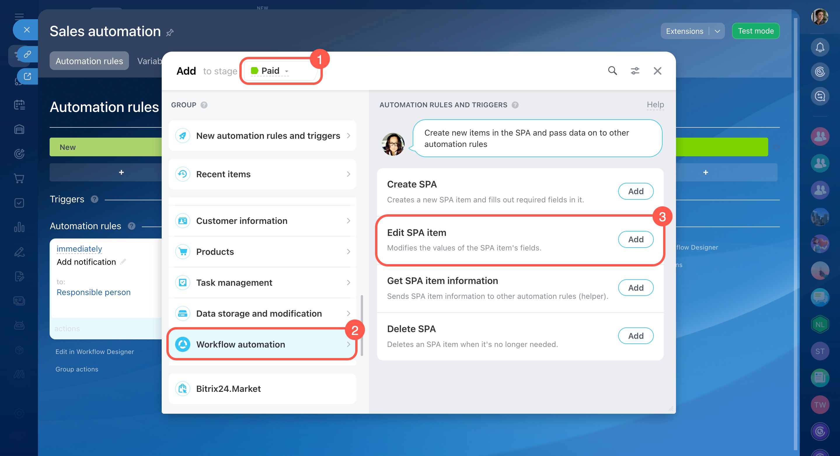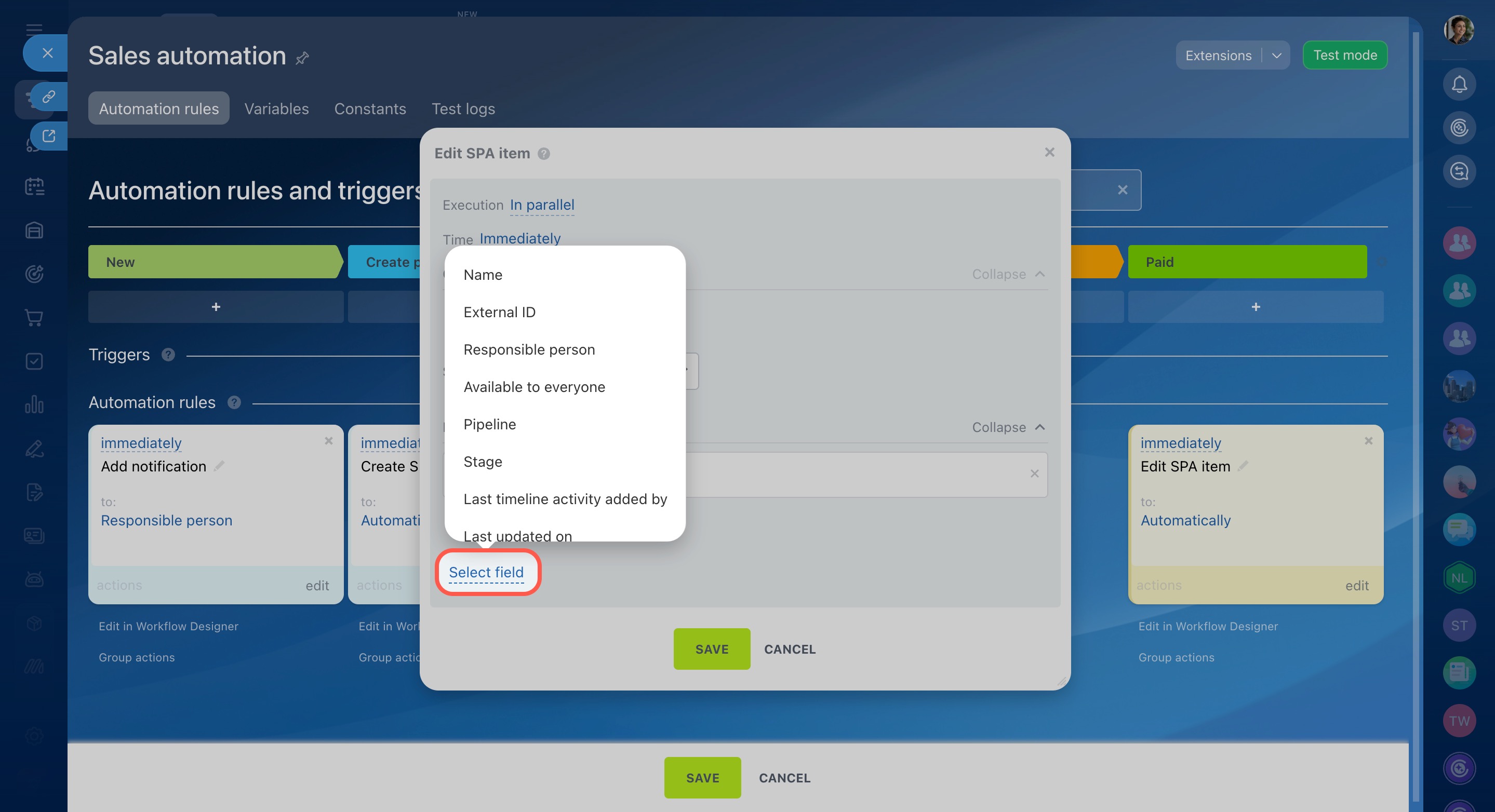 The automation rule changes the SPA item fields. You can use it to automatically add observers, assign another responsible person, or change the stage. For example, when a deal reaches a successful stage, the corresponding SPA item is also moved to a successful stage. This setup is beneficial when both the deal and the SPA item need to be completed at the same time.