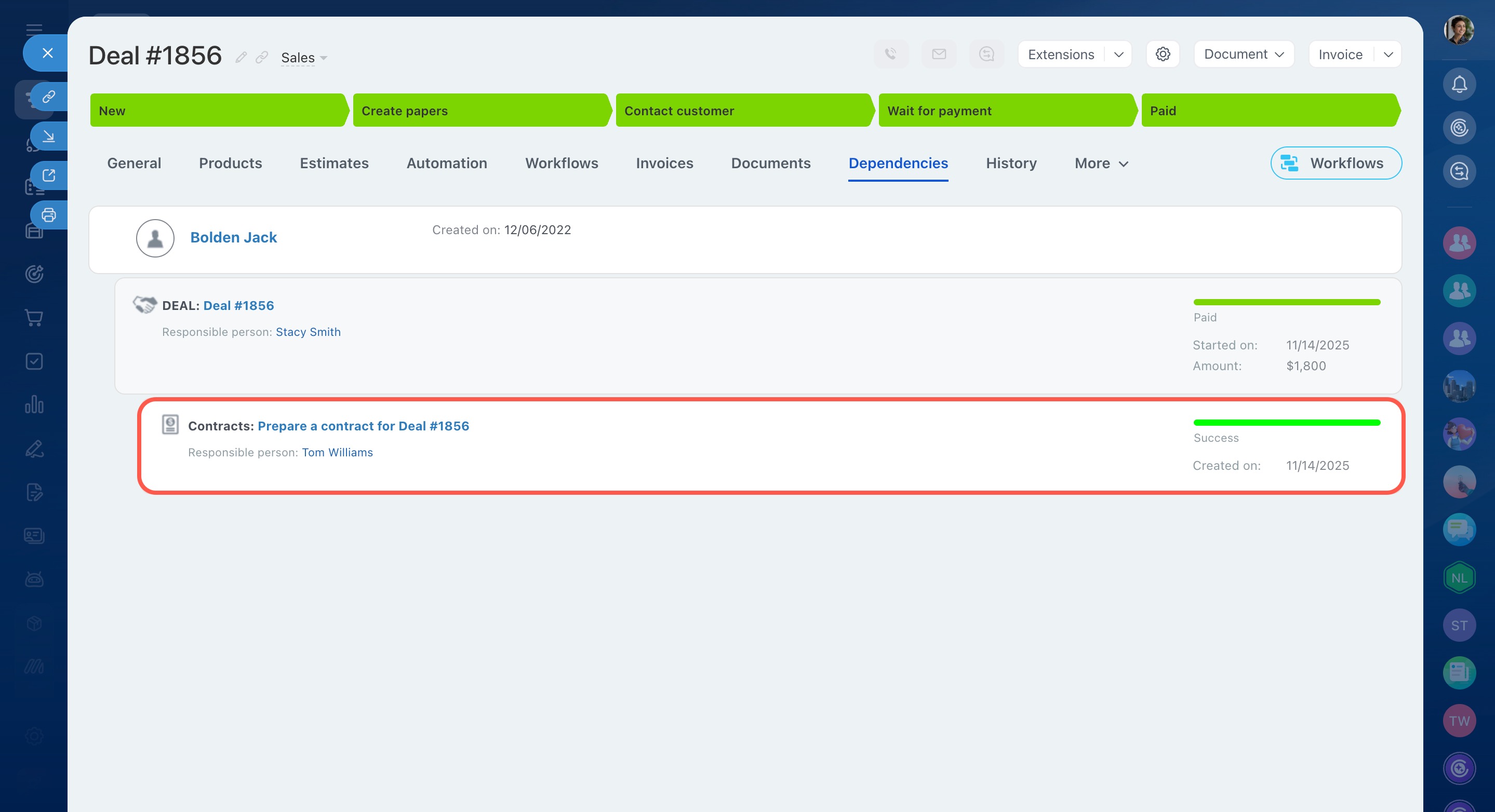 When the deal moves to the "Prepare documents" stage, the automation rule will create a new SPA item. A link to this item will appear in the deal form under the Contracts tab.