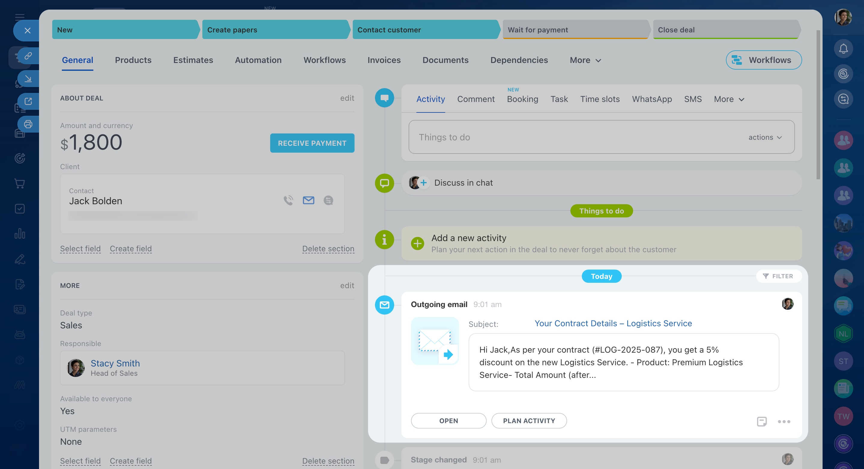 Let's set up two automation rules, "Get SPA item information" and "Send email", at the Contact customer stage. The first automation rule will request data about the amount and product, and the second will send this information to the client.