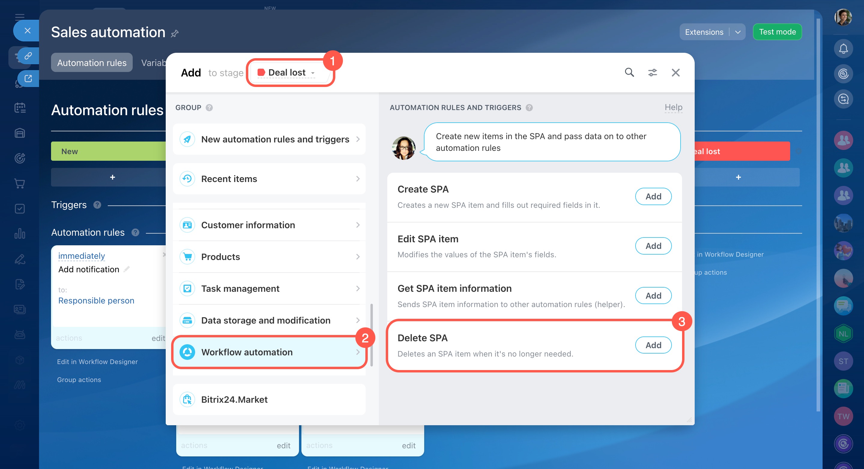 Let's set up an automation rule at the "Deal lost" stage. When a test deal gets to this stage, the automation rule will delete the SPA item created by another automation rule.