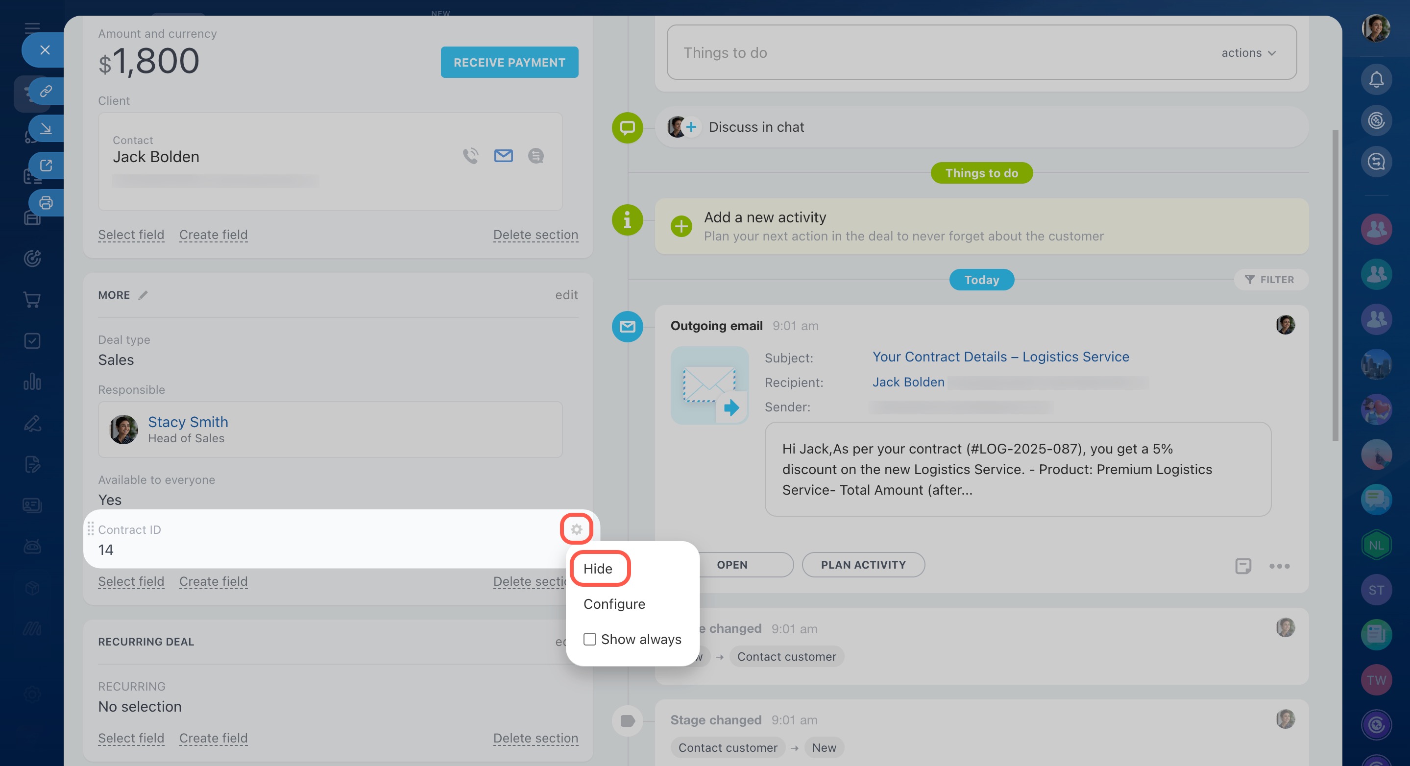 3. Hide the "SPA item ID" custom field (optional): If you don’t want the custom field to be visible in the deal form, click the settings icon next to the field and select Hide.