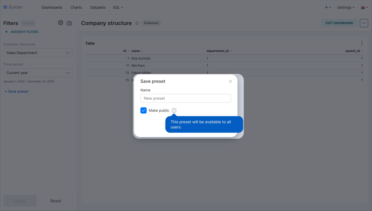 Presets are saved filter sets. They save time by eliminating the need to configure filters repeatedly. The report creator can select the required parameters — period, employees, or deal amount — and save them as a preset. Users can then choose a preset from the list, and the report will immediately adjust to the specified conditions.