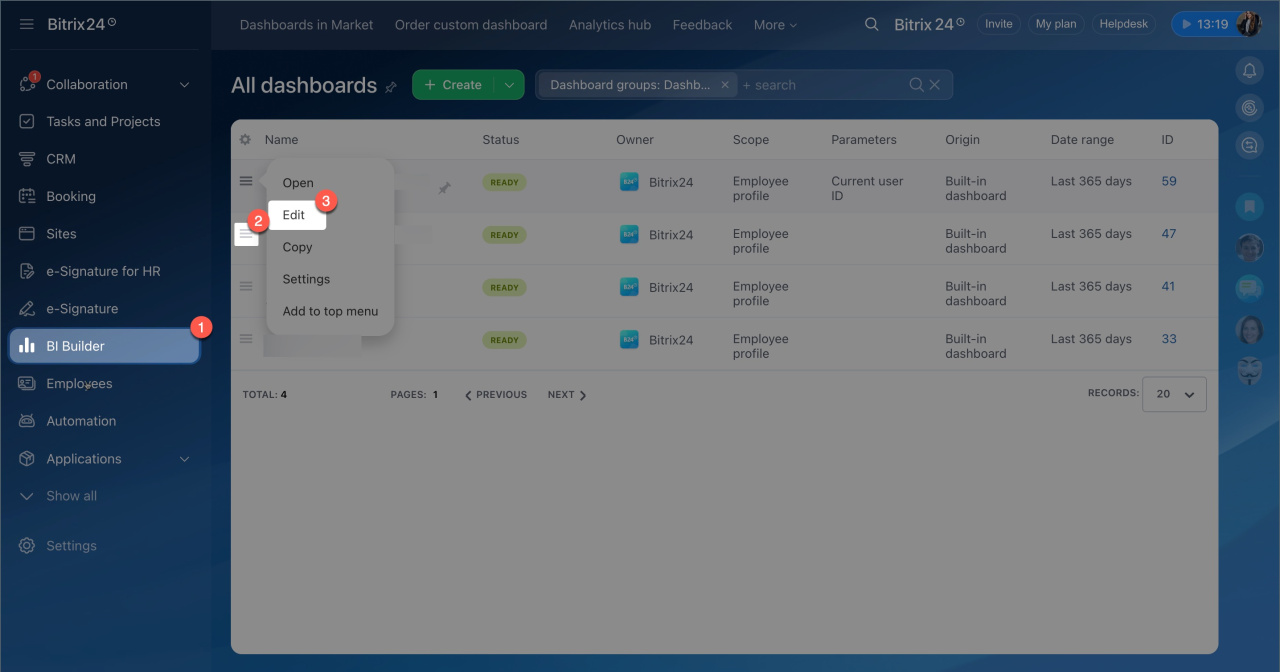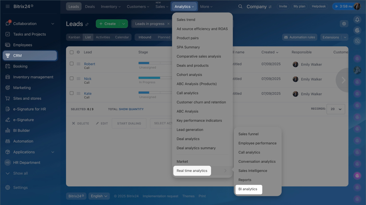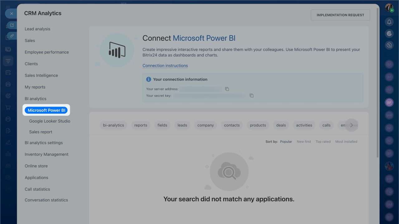 - Open the CRM section > Analytics > Real time analytics > BI analytics.